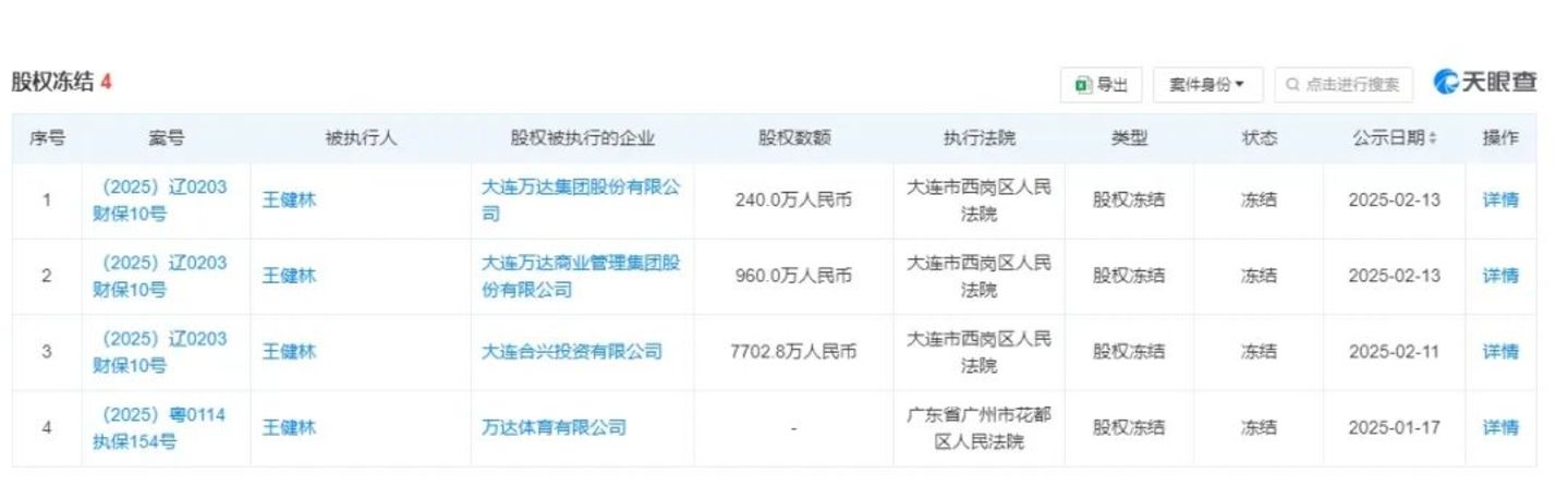 天眼查统计显示,2025年开年以来,王健林已经4次出现持股被冻结,合计被冻结近亿。