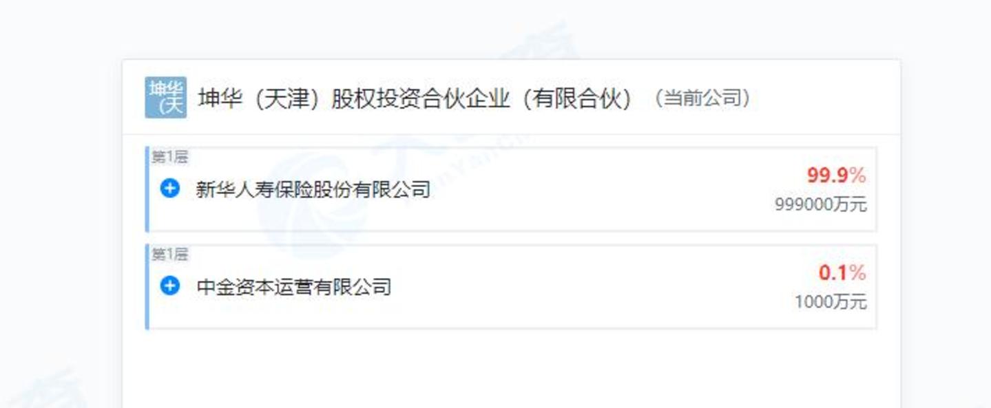 股权穿透后的资料显示,坤华(天津)股权投资合伙企业(有限合伙)的两大股东分别是新华人寿保险股份有限公司和中金资本运营有限公司,持股比例分别为99.9%和0.1%。即新华人寿是坤华股权投资的控股股东。