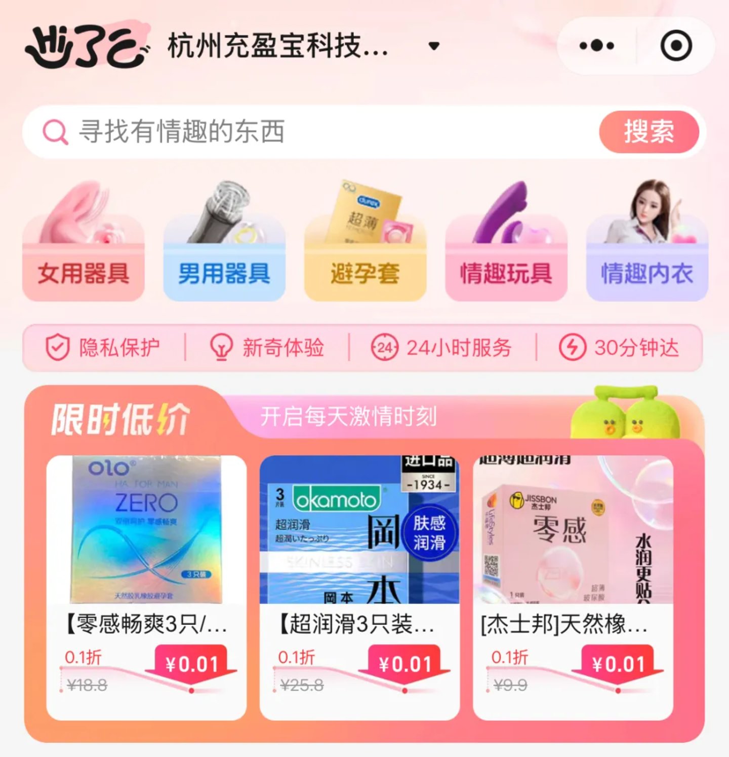 饿了么在2024年3月低调上线成人情趣用品配送平台“Hi了么”,打开小程序也可以发现,“女用器具”被放在产品分类的首个位置,其页面的视觉设计上也是以女性偏好较重的粉色为主。
