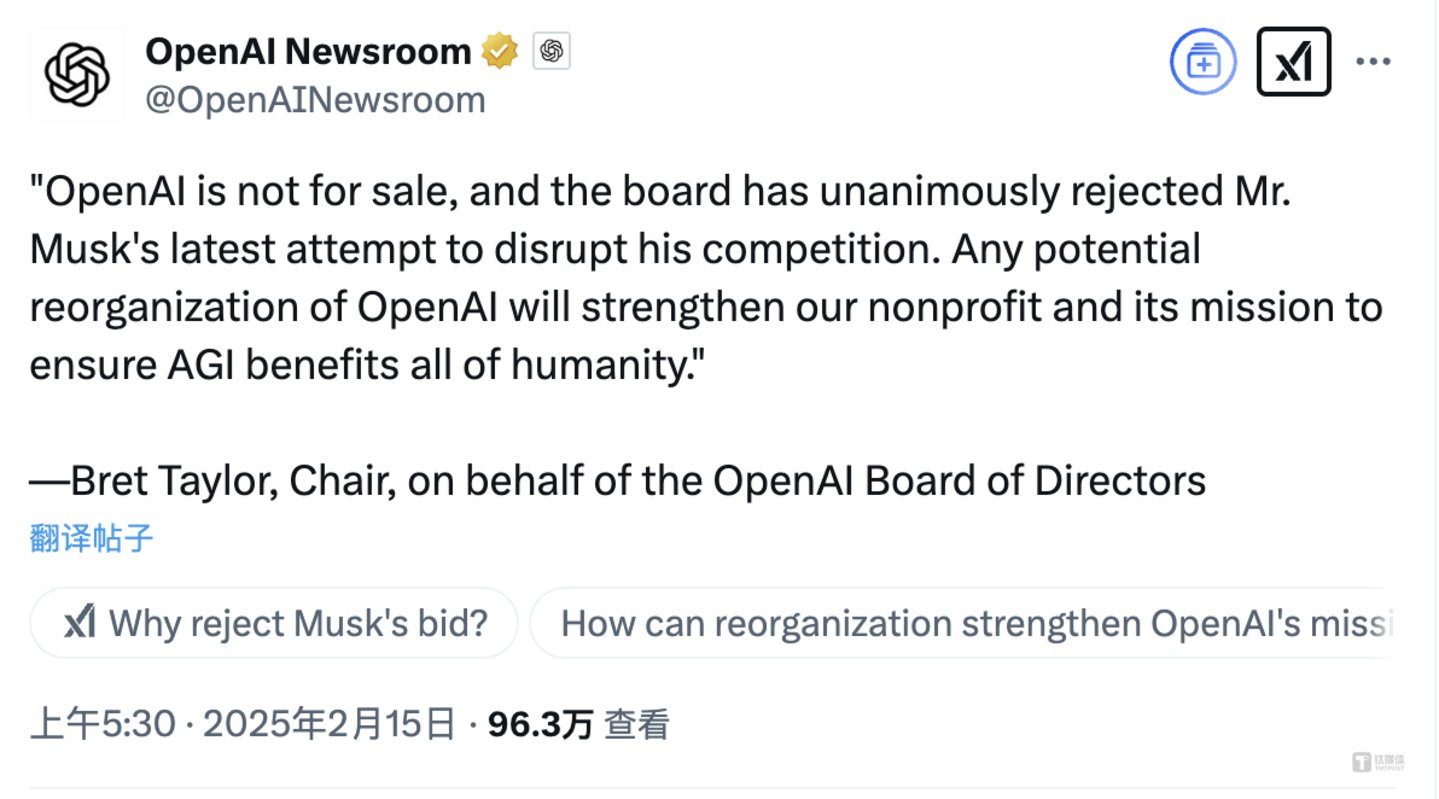 2月16日,OpenAI董事会正式拒绝了马斯克的收购邀约。