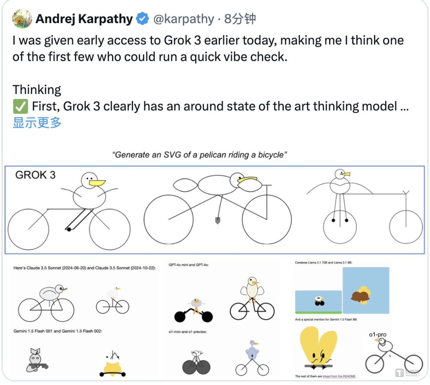 直播结束后,OpenAI联合创始团队成员、AI研究学者安德烈·卡帕斯 (Andrej Karpathy)表示:Grok 3+Thinking ,大概和 OpenAI 最强的模型(比如 o1-pro,月费 200 美元)相当,比 DeepSeek-R1 和 Gemini 2.0 Flash Thinking 略好一些。