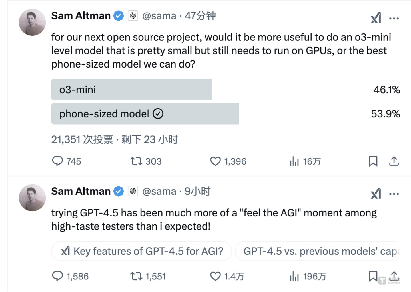 “对于我们的下一个开源项目,我们应当选择开发一个虽然体积小但仍然需要借助 GPU 运行的 o3 mini 层级模型,还是应当致力于开发一个尺寸适合手机且表现最佳的模型呢?”奥尔特曼今早发起投票,最终端侧模型的投票率大幅领先,相比于 o3 mini 的开源,显然高赞评论的网友更希望开源 GPT-4。