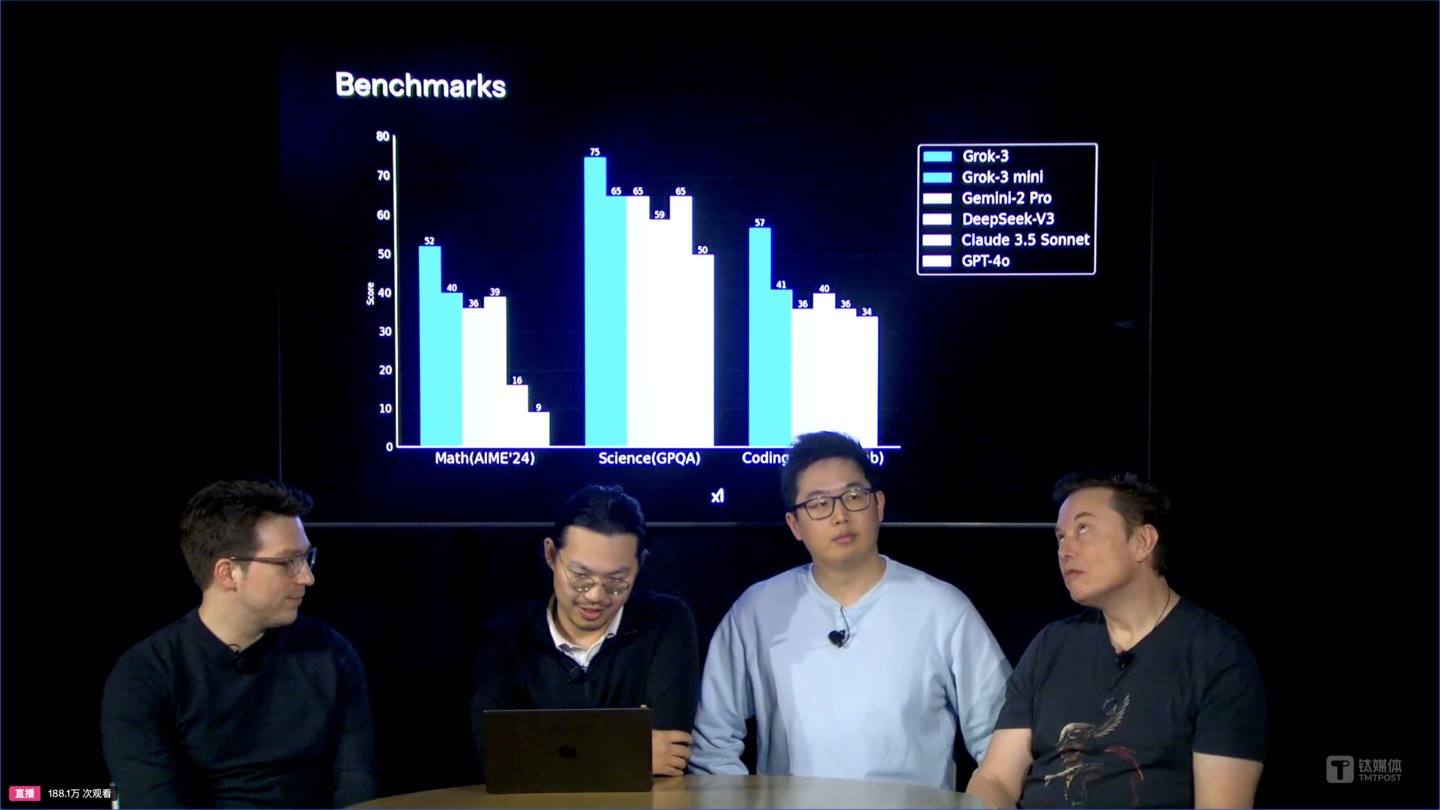 北京时间2月18日12点30分左右,马斯克xAI团队展示和OpenAI一样的发布会形式,三位技术负责人与马斯克一同发布Grok 3基座大模型。在此之前,马斯克称其为“地球上最聪明的人工智能”。