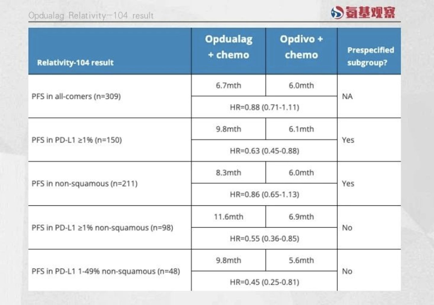 在2期临床RELATIVITY-104中,Opdualag联合疗法组的结果并不如意,ORR和中位PFS分别为51%和 6.7 个月,而仅使用Opdivo和化疗组的数据分别为44%和6个月,这两个结果在统计学上都没有说服力。