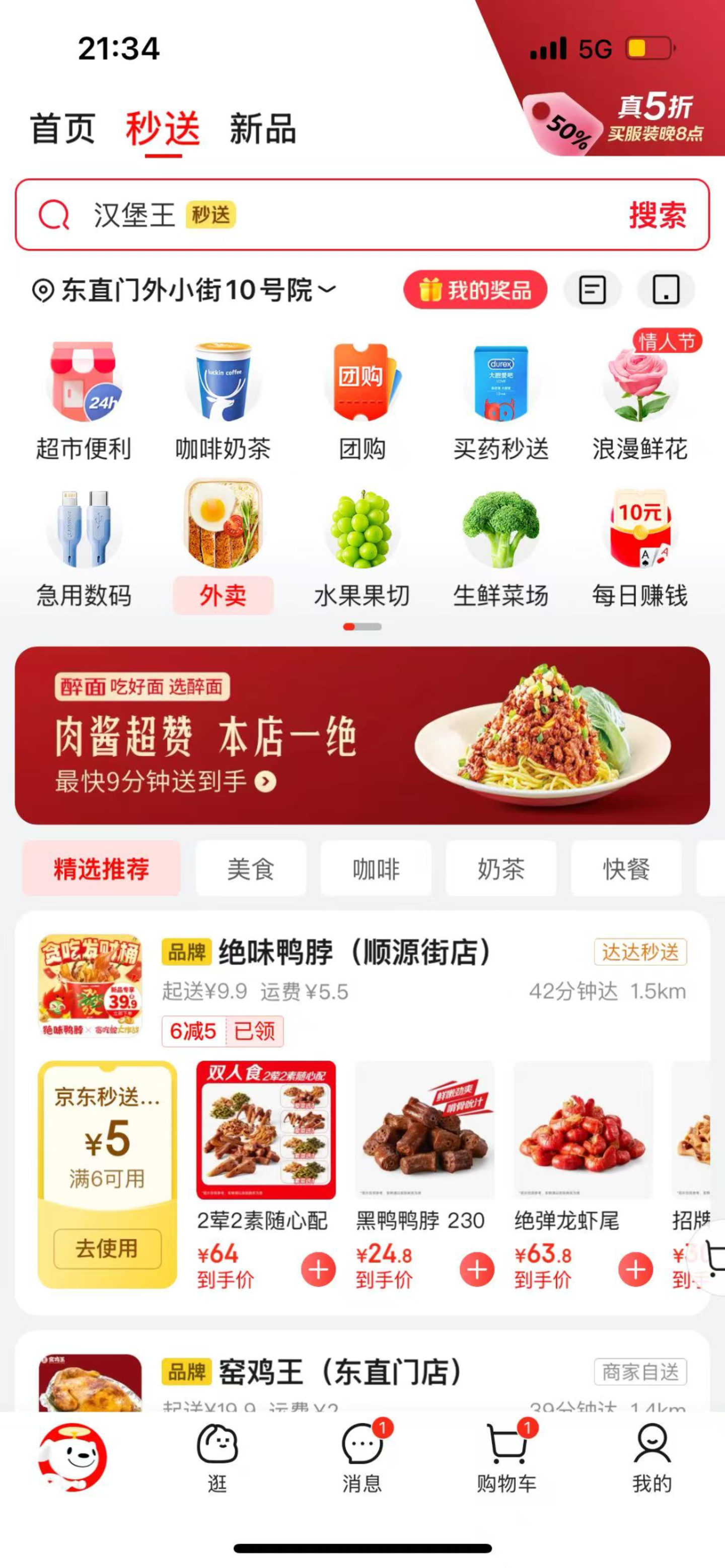 2024年,京东App正式上线“秒送”端口,除了超市便利、买药外,瑞幸、Tims等咖啡、奶茶品牌纷纷上线,以汉堡王等为代表的快餐连锁品牌也入驻其中。2025年初,京东APP改版后“秒送”升级到一级入口,战略地位进一步提升,外卖端口包含在内。