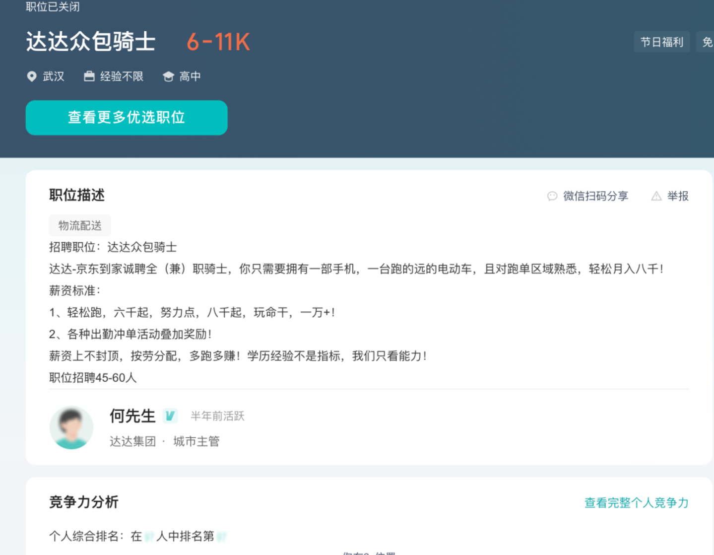 数据显示,达达集团的即时配送网络已覆盖全国2600多个县区市,约有超过120万骑手进行配送协作。在Boss直聘上,达达众包骑士在武汉地区的薪资标准为每月6000-11000元,青岛达达外卖骑手的薪资为每月4000-9000元。