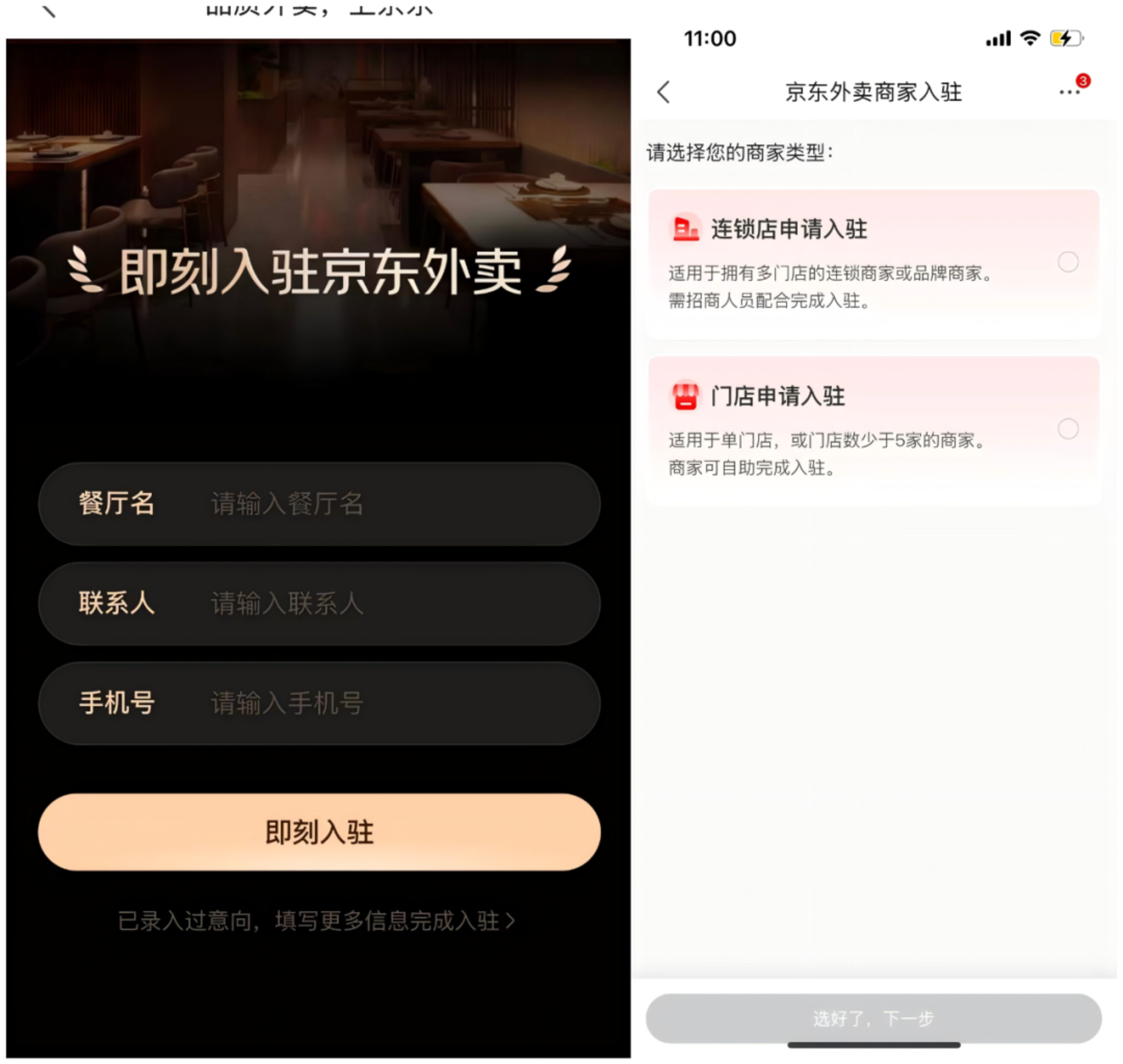 另外,二级页面更新外卖招商信息,商家填写餐厅名和联系方式,商家可选择连锁店和门店方式申请入驻。