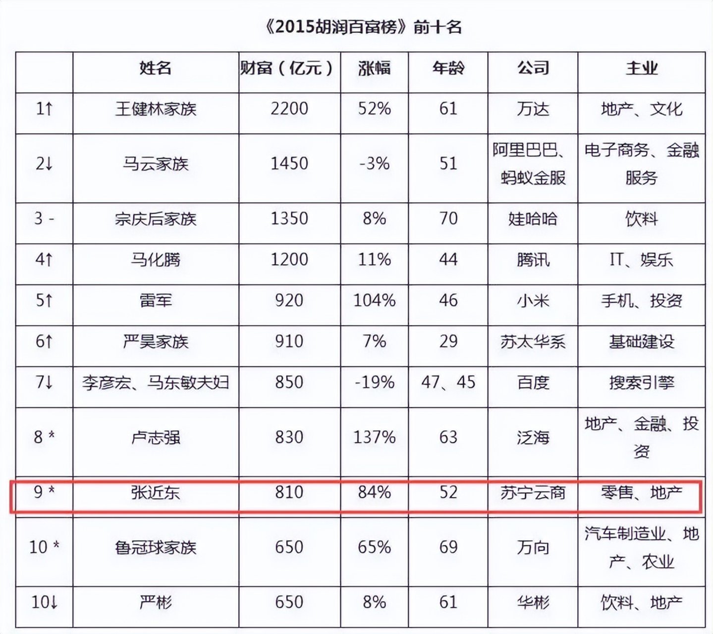 2015年,张近东更是以810亿身家登上胡润百富榜第九位,站上了人生巅峰。
