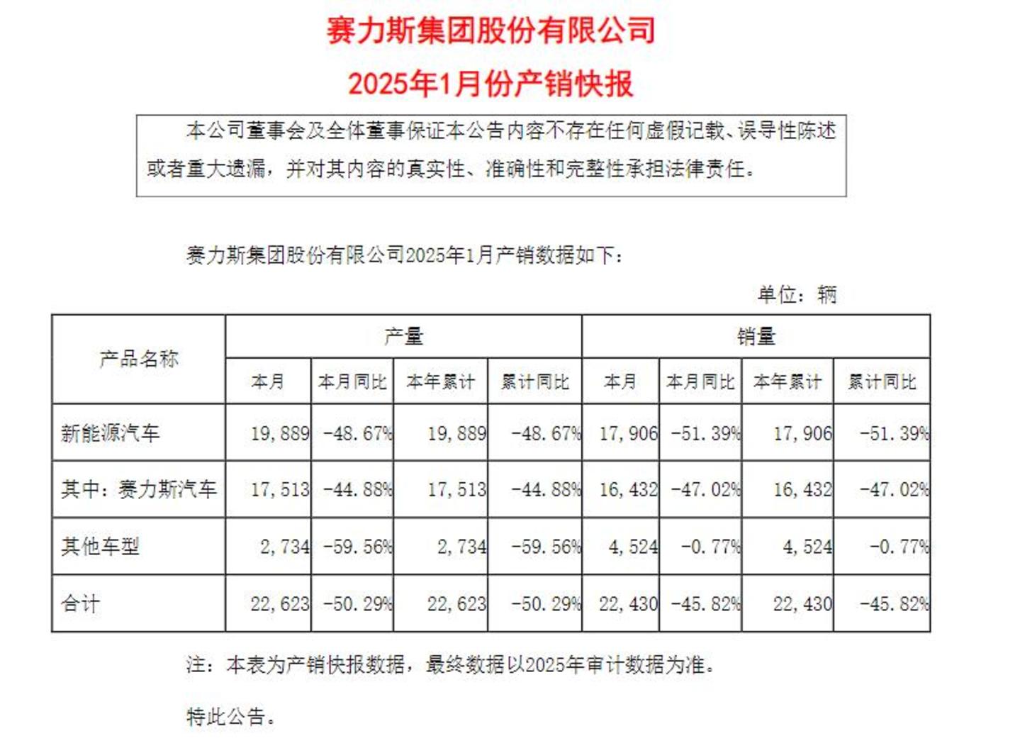 赛力斯2025年1月产销快报,图/Choice