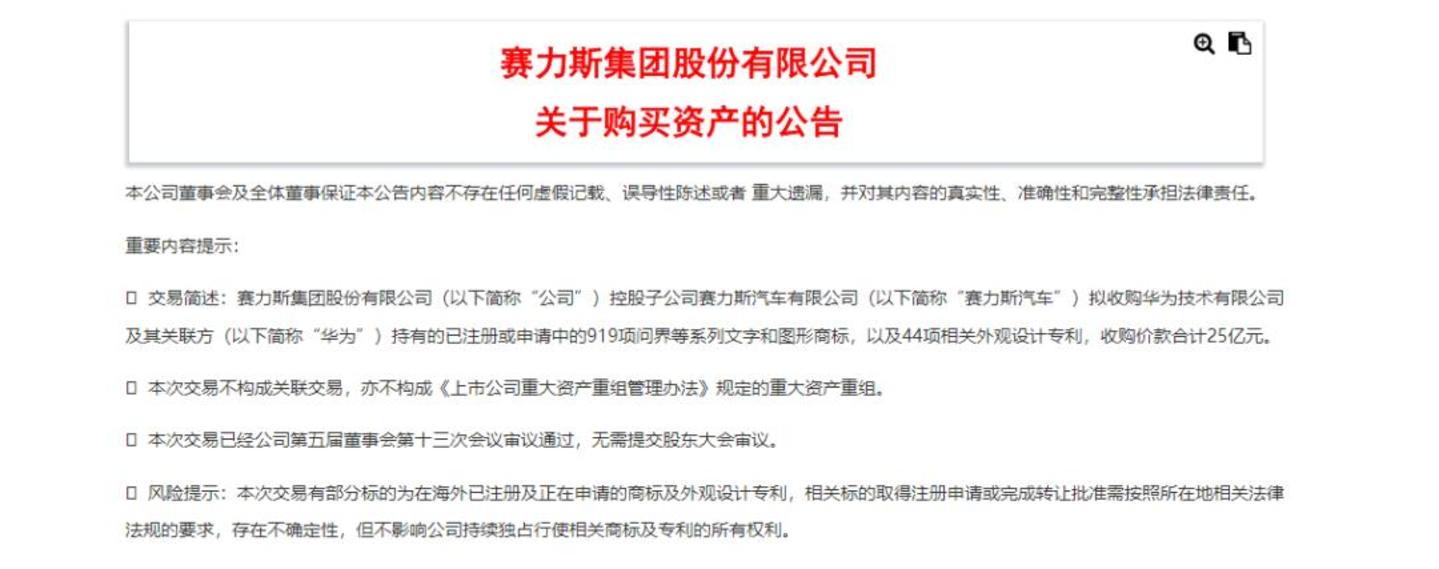 去年7月,华为曾以25亿元的价格,向赛力斯转让已注册或申请中的919项问界等系列文字和图形商标,以及44项相关外观设计专利。
