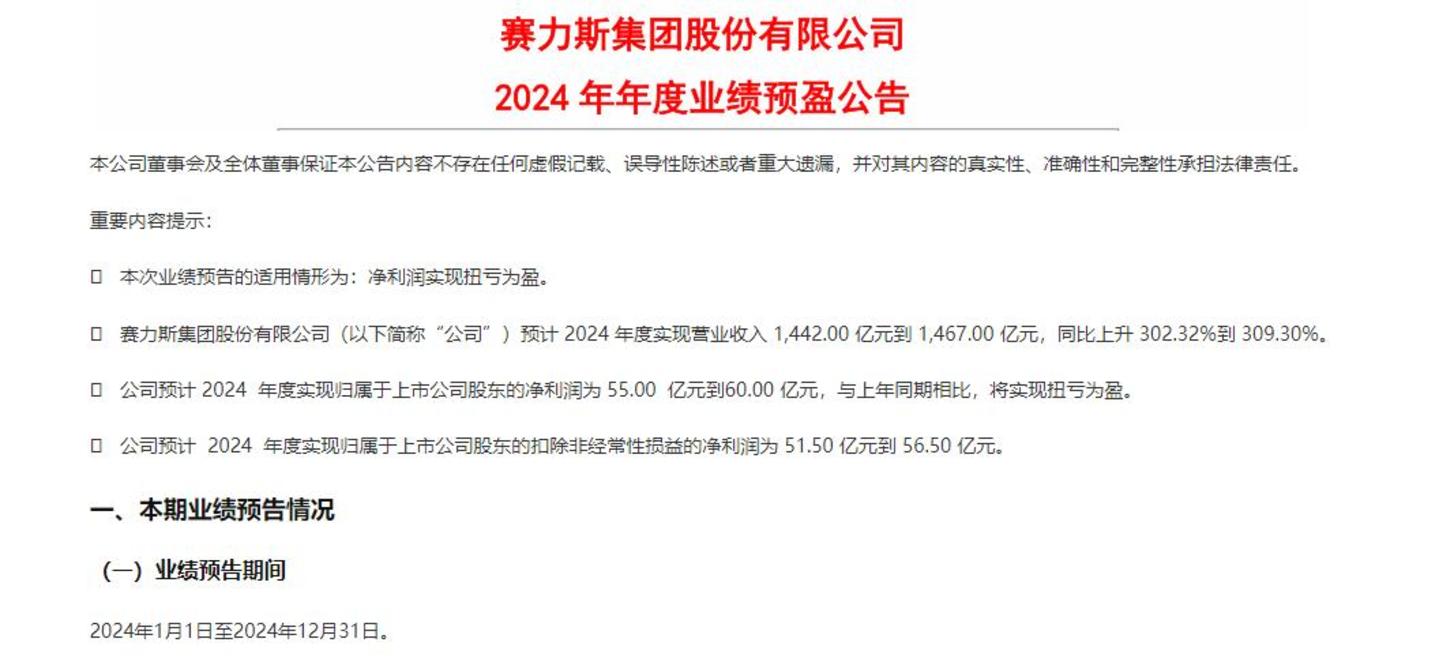 今年1月,赛力斯发布的2024年年度业绩预告也十分亮眼,预计2024年度实现营业收入1442亿元到1467亿元,同比增长302.32%到309.30%;预计2024年实现归属上市公司股东的净利润为55亿元至60亿元,与上年同期相比将实现扭亏为盈。