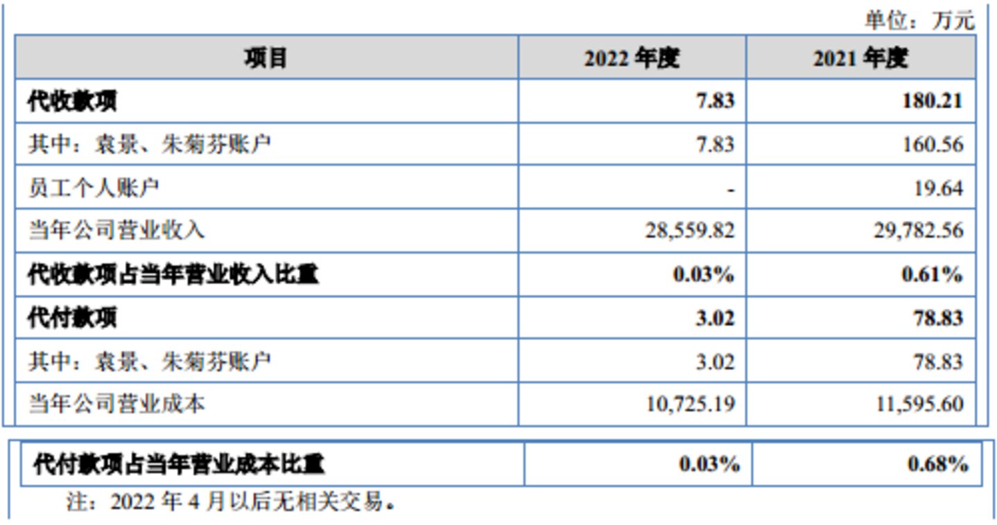 报告期内,2022年3月末前,爱得科技存在通过实际控制人黄美玉之外甥女袁景、财务人员朱忠华之母亲朱菊芬个人账户代收、代付款项的情形。代收款项主要为代收小额货款、经销商押金及少量供应商质量扣款等,代付款项主要为代付高管奖金、无票费用、经销商押金退还、退货款等,相关代收代付行为构成实际控制人资金占用。此外,出于款项收取的便利性和及时性,公司存在使用祝晓泉(子公司爱科硕销售负责人)等个别员工的个人账户收取货款、废料销售款项的情形,该部分销售回款已及时、足额入账。具体数据如下所示: