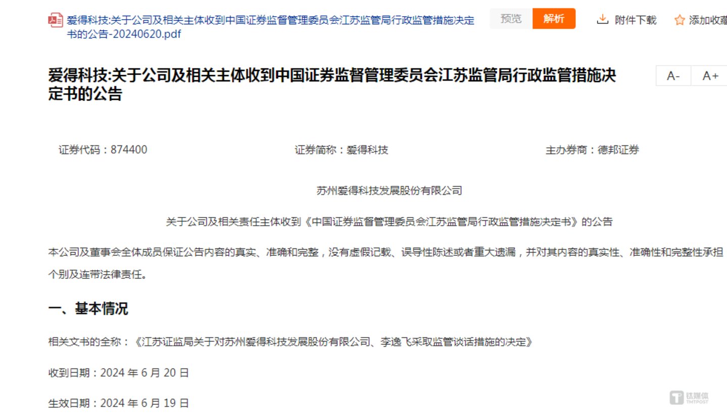 公开资料显示,2024年6月27日,爱得科技提交的申报稿被北交所受理。申报稿受理前的2024年6月20日,江苏监管局对爱得科技、李逸飞采取监管谈话措施的决定,原因是2015年至2017年上半年,爱得科技与关联方常州苏天鸿医疗器械销售有限公司发生关联交易,金额分别为332.26万元、476.51万元、293.69万元;与关联方广州纵途医疗科技有限公司发生关联交易,金额分别为8.41万元、354.57万元、242.90万元。爱得科技未及时就上述关联交易履行审议程序并进行信息披露,违反了相关规定。因此,江苏监管局决定对爱得科技、李逸飞采取监管谈话的监督管理措施,并记入证券期货市场诚信档案。