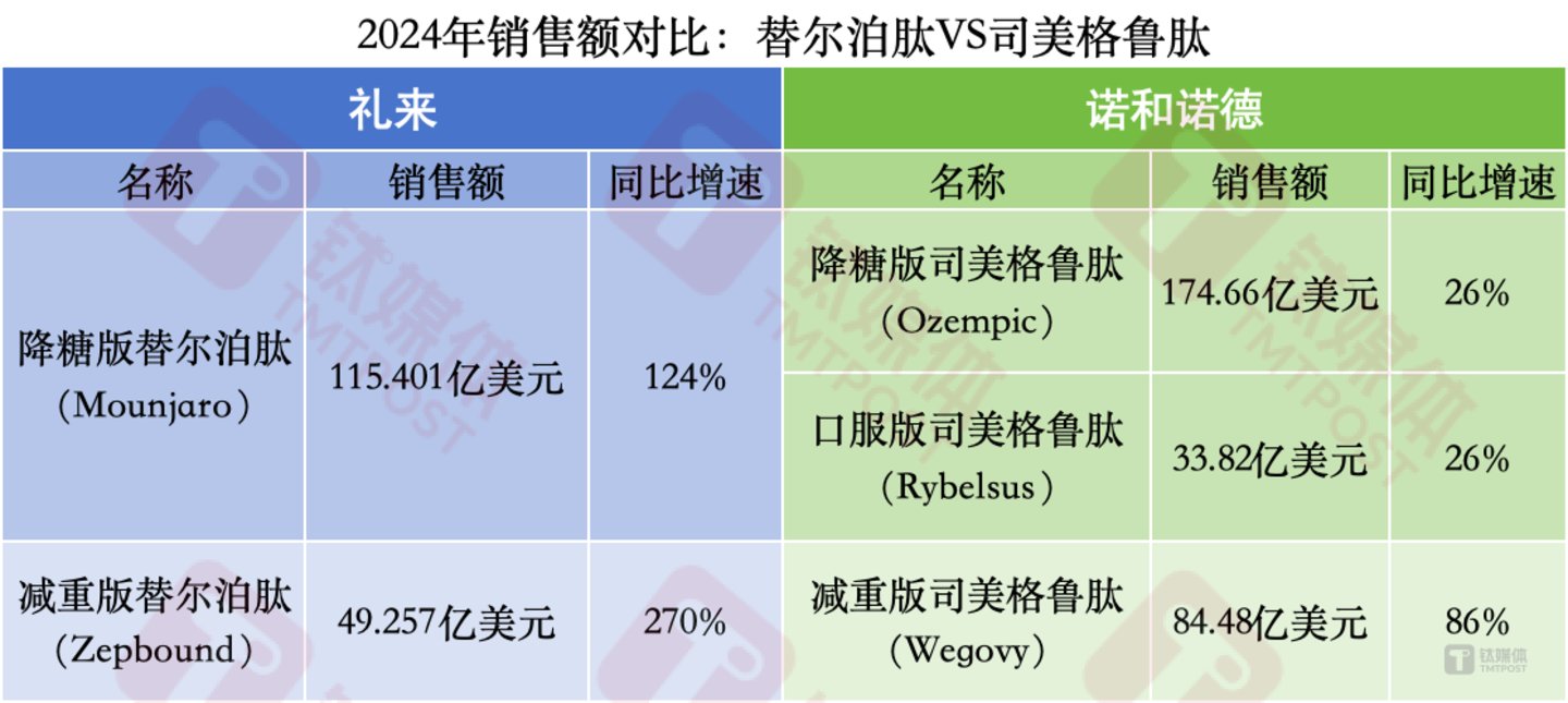另据2024年财报,虽然礼来的替尔泊肽销售额目前还比不过诺和诺德的司美格鲁肽,但增速碾压后者,这带给市场的预期更强。需要注意的是,礼来的Zepbound于2023年11月8日在美国获批。