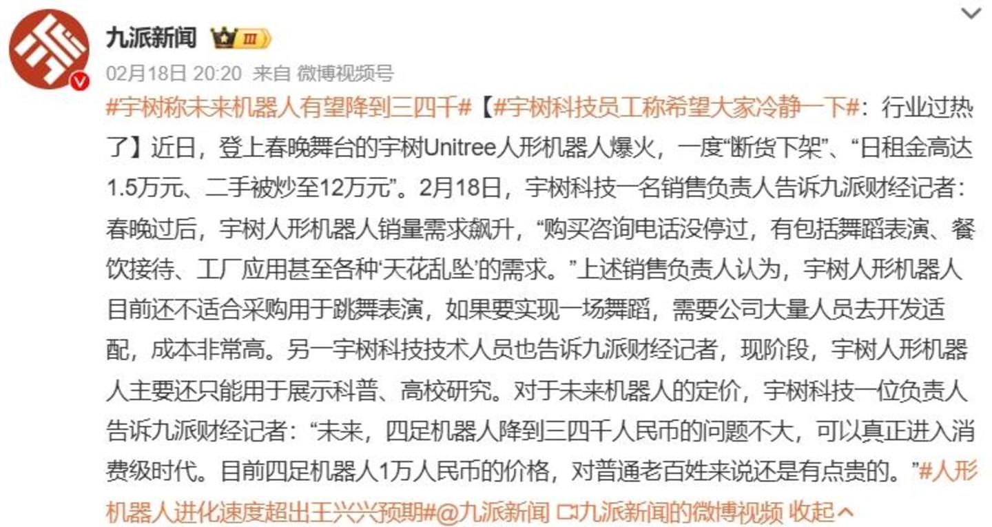 值得一提的是,由于宇树人形机器人登上春晚爆火,近期宇树售价9.9万元的消费级人形机器人G1、售价65万元的工业级人形机器人H1人形机器人在上线京东平台后迅速售罄下架。对于机器人的定价,宇树科技工作人员对“九派新闻”表示:“未来,四足机器人降到三四千人民币的问题不大,可以真正进入消费级时代。目前四足机器人1万人民币的价格,对普通老百姓来说还是有点贵的。”
