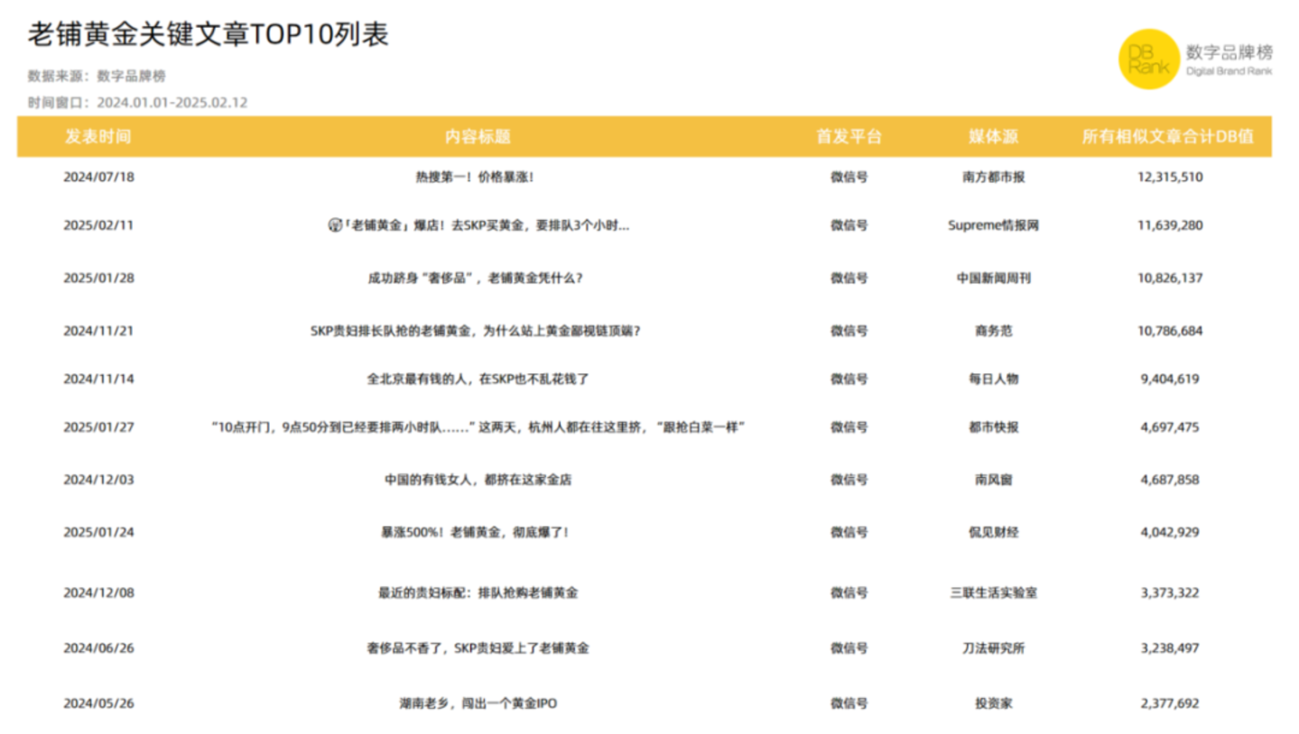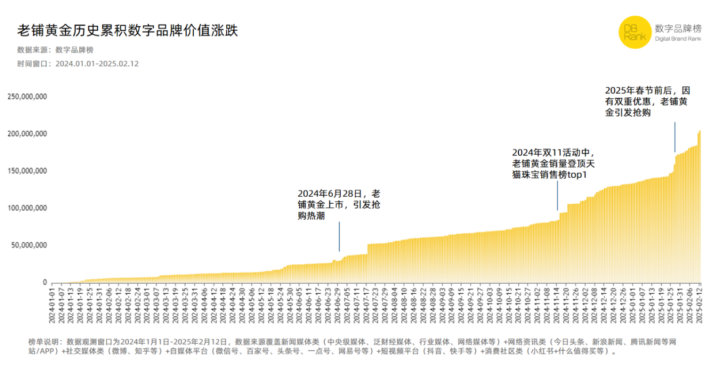 根据『数字品牌榜』以2024年1月1日-2025年2月12日为监测窗口的研究数据来看,监测期间,老铺黄金的历史累积DB值一直呈现稳步上升趋势,期间两次大幅提升,一次是因为品牌于港交所上市,引发抢购热潮,一次是因为双11销量登顶天猫珠宝销售榜top1,均符合品牌传播规律。