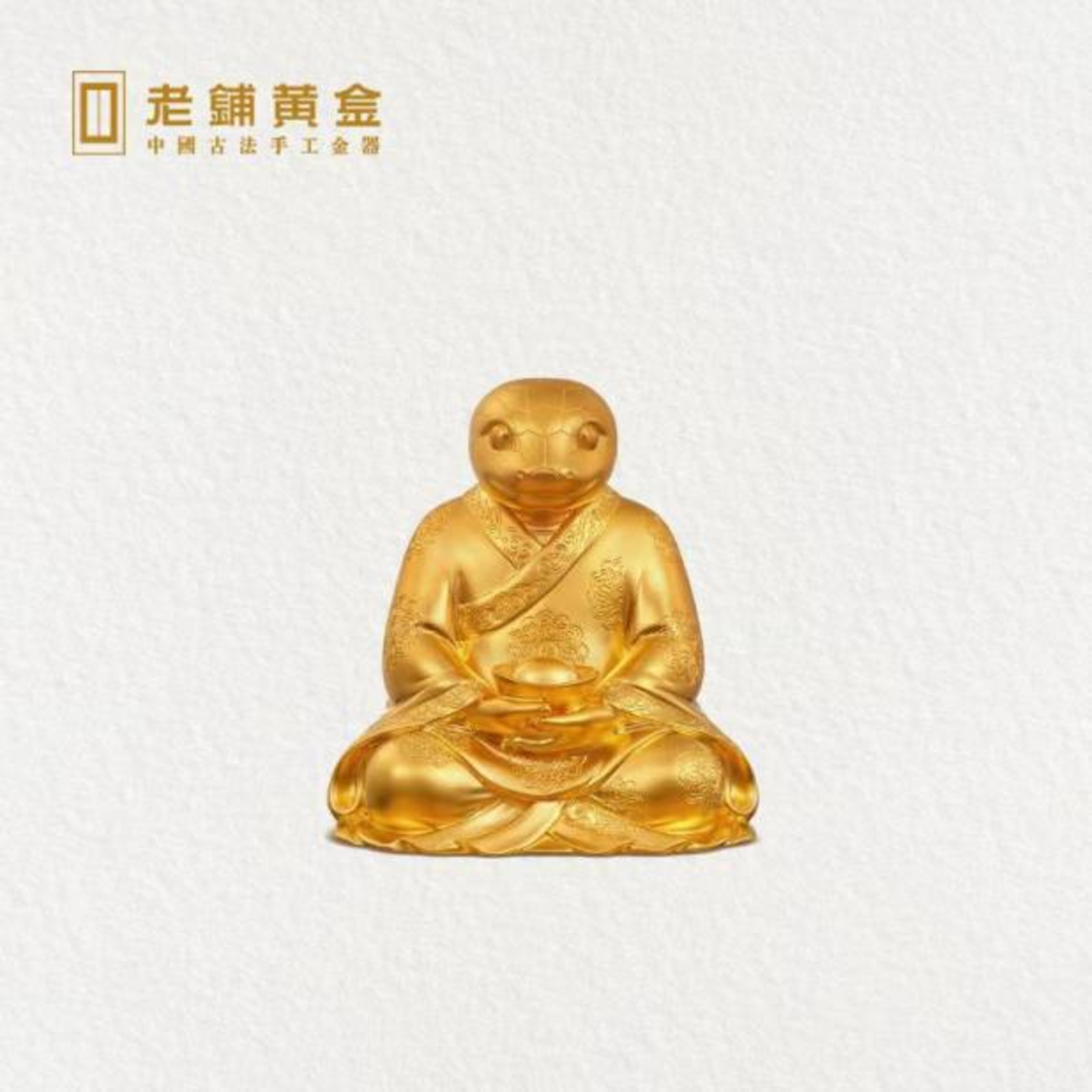 例如老铺黄金在蛇年推出的“巳蛇神像”摆件,就取型自故宫珍藏的“青玉十二生肖”,采用古法铸型、手工錾刻工艺制作,像是一件精美的文物。