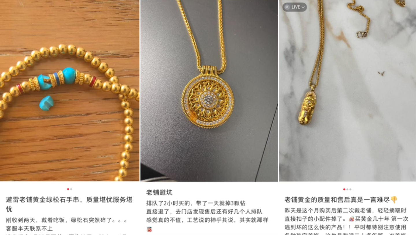 再加上,老铺黄金的质量似乎参差不齐,社交媒体上时不时就能刷到断链或断卡扣的“祛魅案例”。最落地的产品关都把控不好,即使品牌再会讲故事、营造概念,也笼络不住消费者的心。