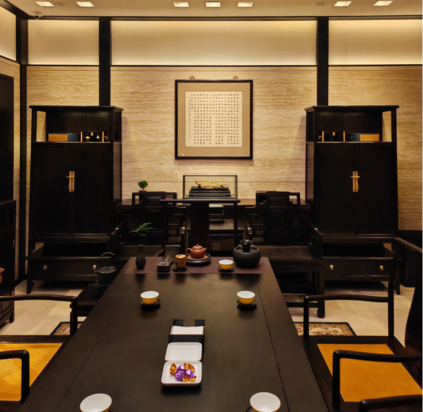 从门店装潢到服务,老铺黄金也致力于向奢牌看齐,将购物行为升华为身份认同仪式:比如门店采用博物馆场景化的设计,使用大量的黑色系元素,营造出中式古朴氛围;等候区配置依云矿泉水与Godiva巧克力,排队被设计成“可传播的奢侈瞬间”;服务采用专属1对1,无论店外队伍排的有多长,柜哥柜姐只专注服务你一人;VIP客户会被邀请进专属茶室,用金器品茗选款,还能欣赏大量难得一见的黄金艺术品。