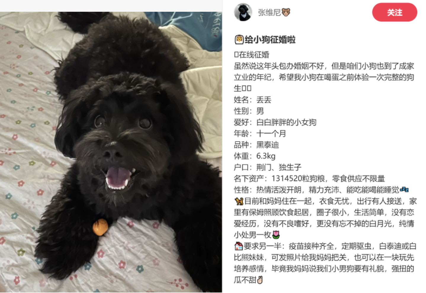 “虽然说这年头包办婚姻不好,但是咱们小狗也到了成家立业的年纪,我希望另一半:疫苗接种齐全,定期驱虫。可发照片给我妈妈把关,也可以在一块玩先培养感情......”