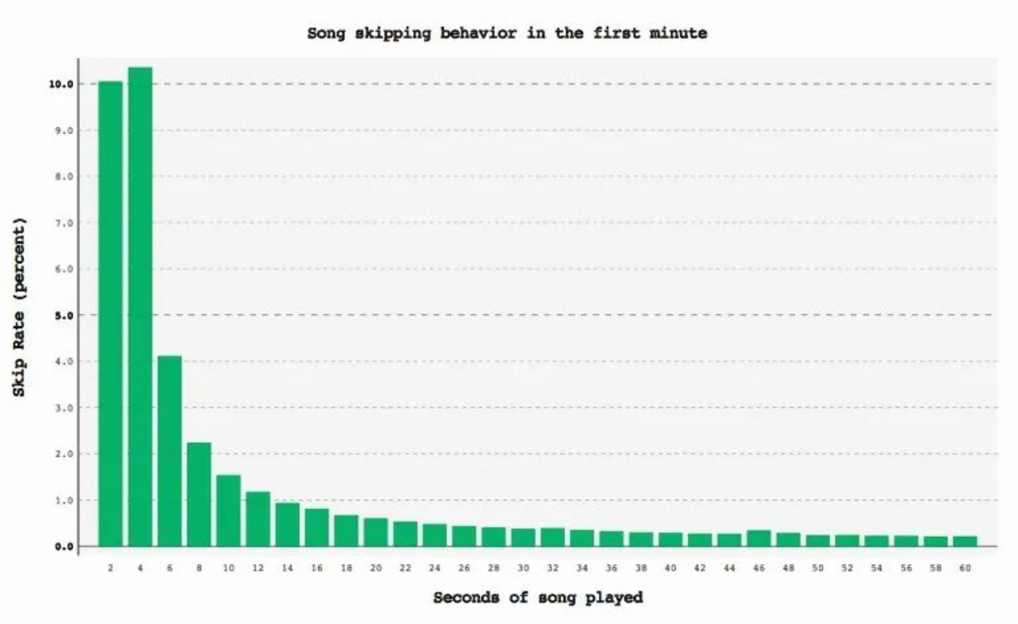根据数据分析师Paul Lamere的研究,以Spotify为例,倘若用户选择跳过歌曲,在前5秒内切歌的可能性为24.14%,前10秒内为28.97%,前30秒为35.05%。由图表可以更直观看出,针对不喜欢的歌曲,用户大概率会在前5秒内切歌。