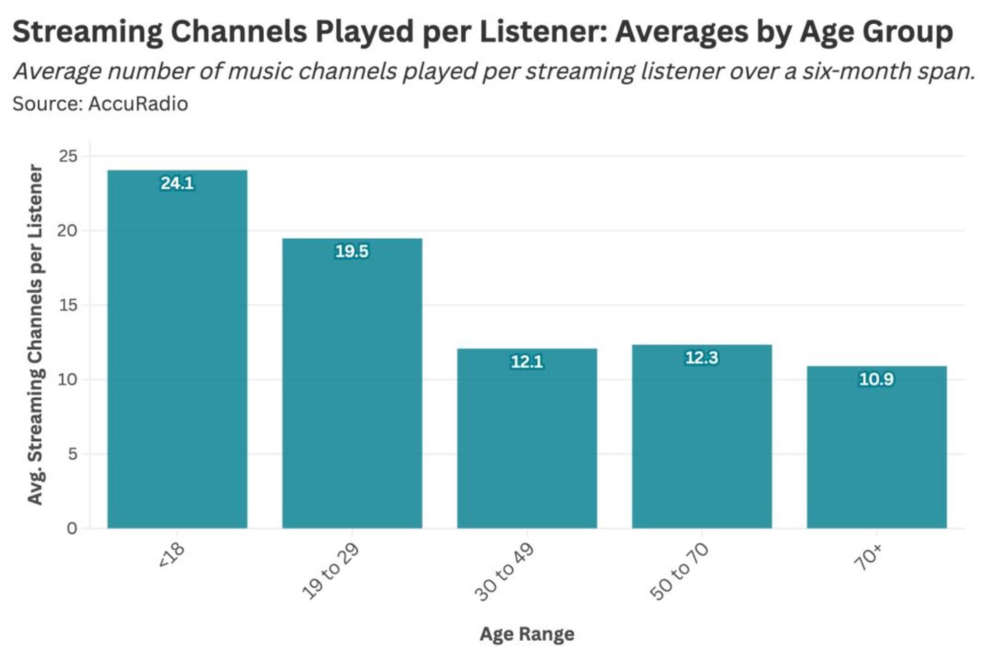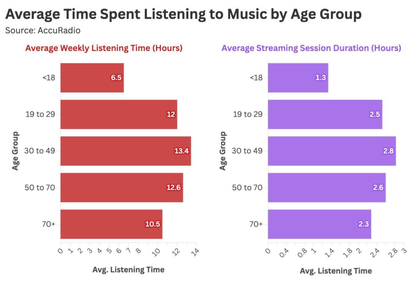 Stat Significant 的另一组数据,揭示了AccuRadio不同年龄段用户在收听时长上的差异。30-49岁用户平均每天收听时间最长,达到2.8小时,每周累计使用时间达13.4小时。然而大部分时间里,他们只在有限的歌单和少数喜爱的歌曲中反复循环。