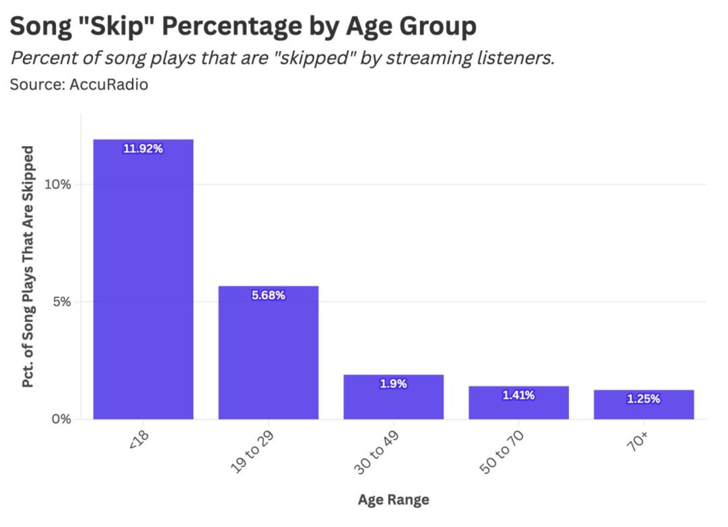 Stat Significant的数据表明,AccuRadio平台上,18岁以下用户群体的切歌频率高达11.92%,而30岁以上群体则不到2%。这样鲜明的数据差异,乍看可能让人误解——表面上,年轻人频繁切歌似乎意味着审美不够包容,总是拒绝那些不合胃口的新奇曲目;相较之下,年长的听众看似更愿意接受APP推荐的歌曲。