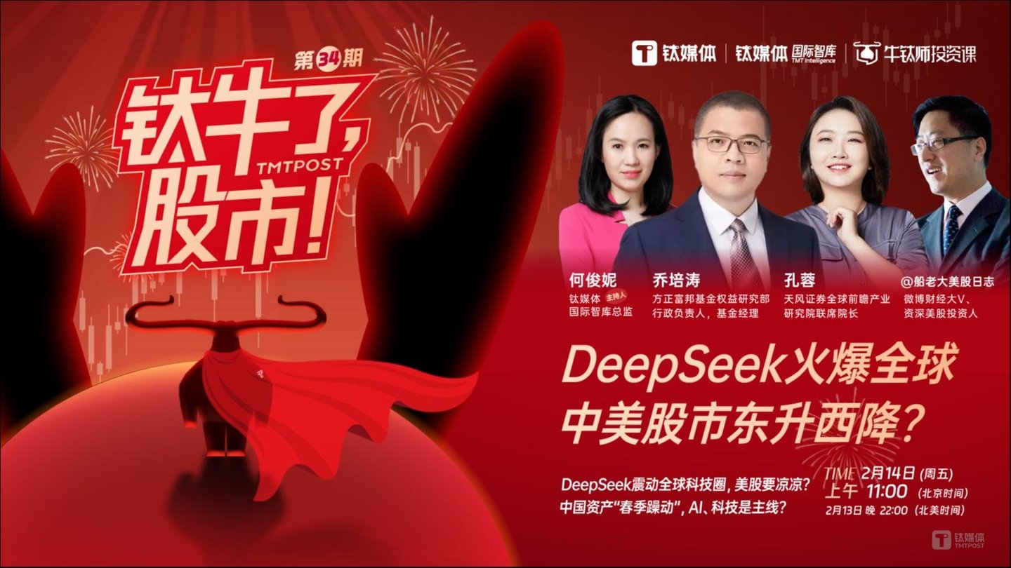本期《钛牛了,股市!》钛媒体国际智库总监何俊妮,特邀方正富邦基金权益研究部行政负责人,基金经理乔培涛、天风证券全球前瞻产业研究院联席院长 孔蓉、微博财经大V、资深美股投资人 @船老大美股日志 ,一起为投资者深度解析DeepSeek对全球科技圈及中美金融市场的重大影响。