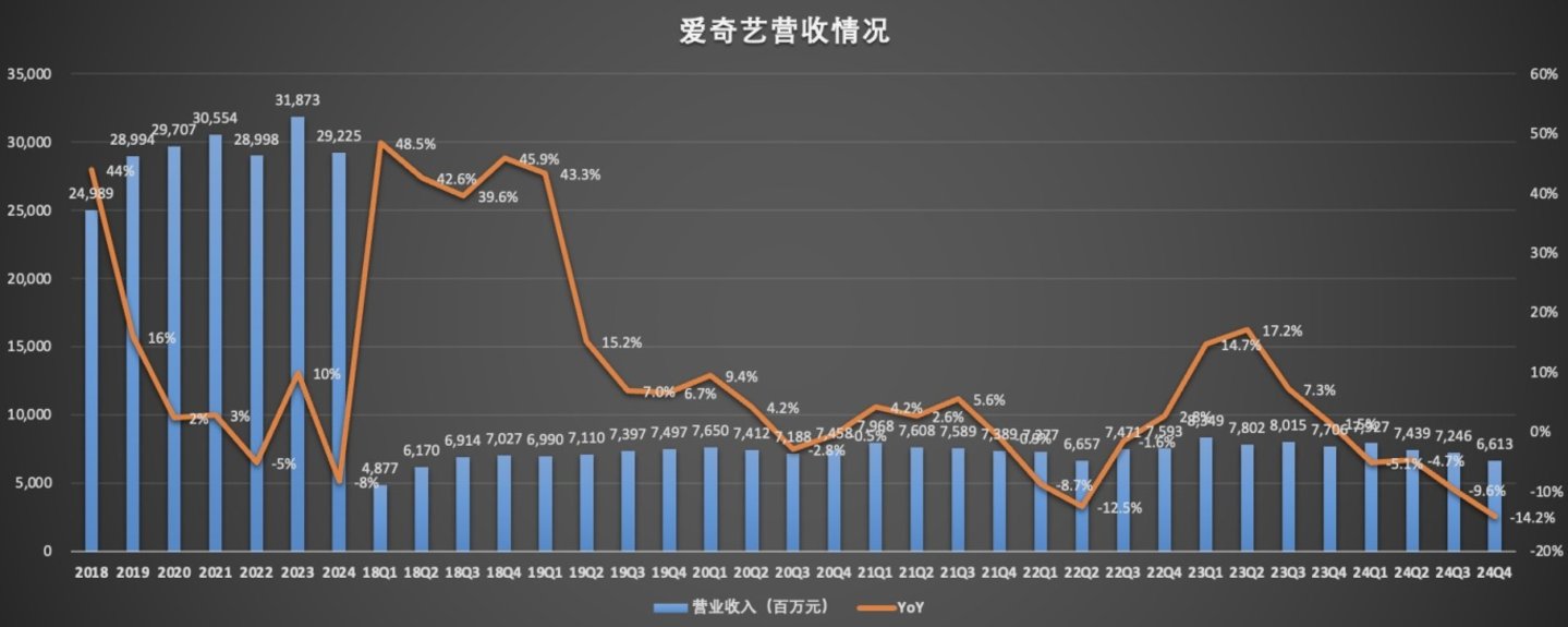 数据显示,2024年第四季度,爱奇艺营收为66.1亿元,同比下降14%,已连续四个季度下滑;全年营收292.3亿元,同比下降8%。