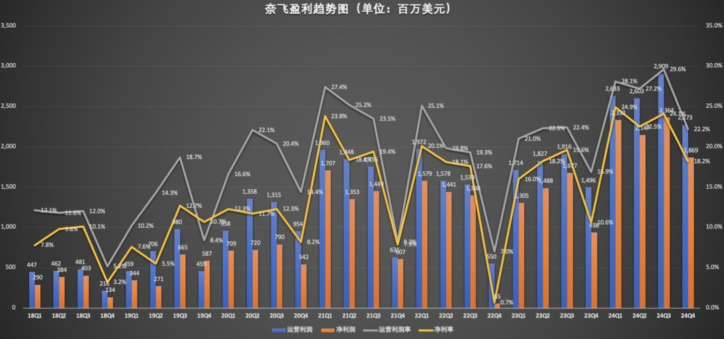 奈飞已实现稳定盈利。奈飞2024年第四季度净利润为18.7亿美元,同比增长99.3%,营业利润同比增长52%至23亿美元。全年净利润达到87亿美元,同比增长61%,营业利润首次突破百亿美元,达到104.2亿美元,同比增长50%。