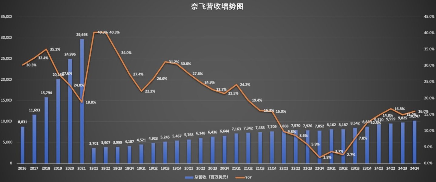 相比之下,奈飞在2024年四季度的业绩表现却非常亮眼。2024年第四季度,奈飞实现营收102.5亿美元,同比增长16%;全年营收达到390亿美元,同比增长15.7%。