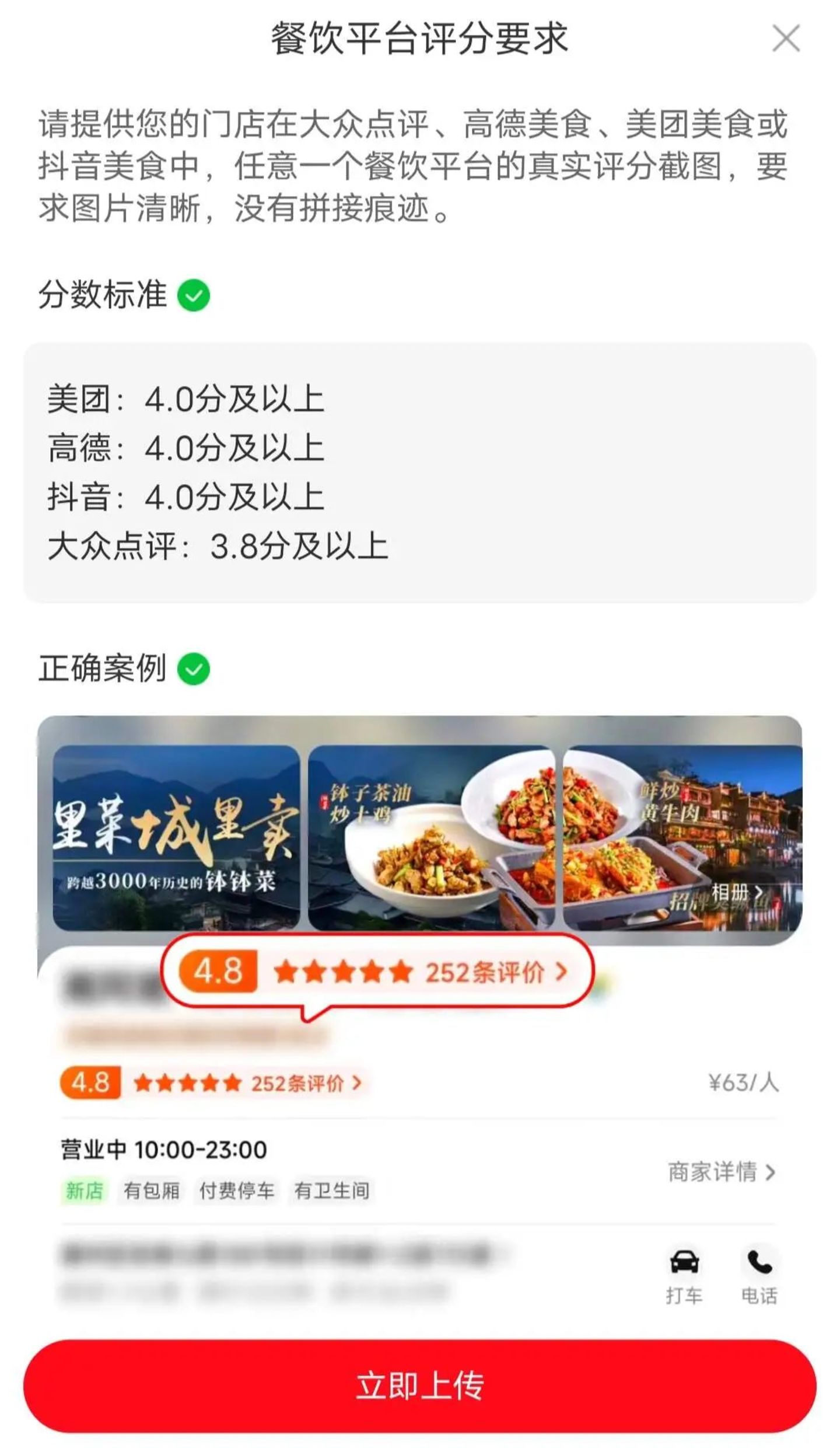 值得一提的是,京东外卖要求商家提供在美团、高德、大众点评、抖音任意一个平台的店铺评分截图,美团、高德、抖音的分数标准在4.0分及以上,大众点评为3.8分及以上——这可以理解为“品质”之上的硬性门槛。