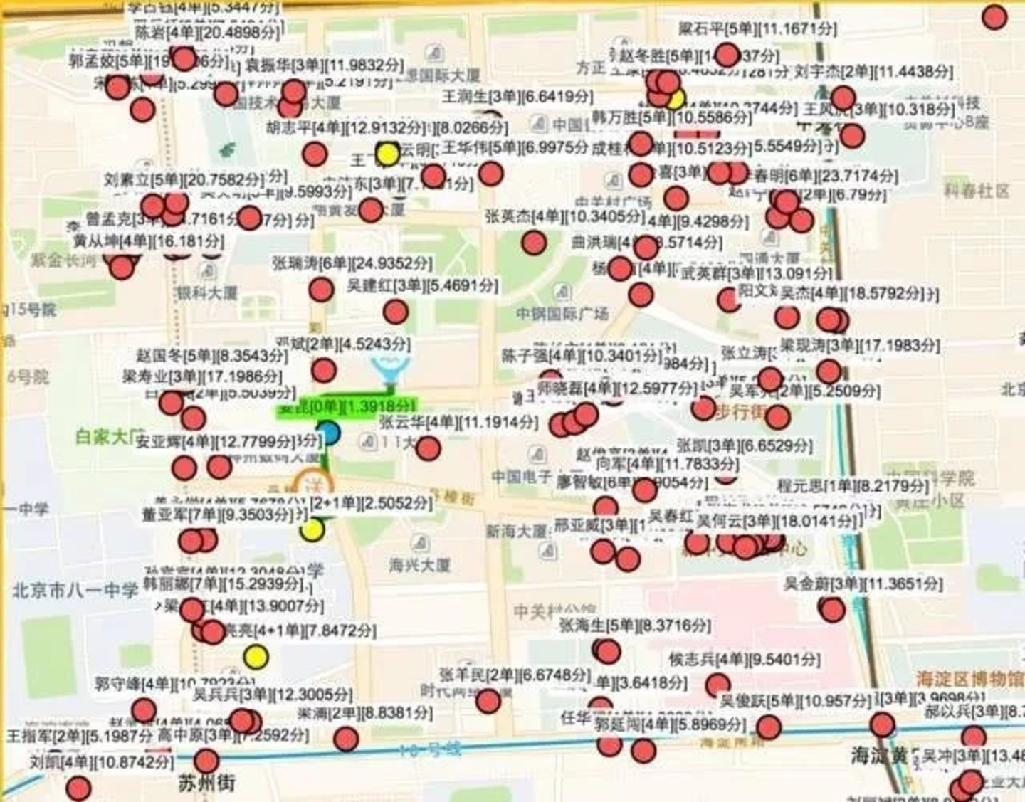 一个外卖配送区域上,众多骑手的分布示意图