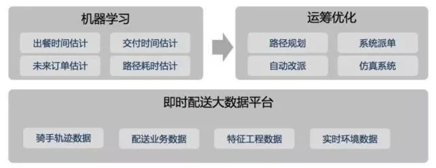 最后机器学习模块负责从数据中寻求规律和知识,例如对商家的出餐时间、到用户所在楼宇上下楼的时间、未来的订单、骑行速度、红绿灯耗时、骑行导航路径等因素进行准确预估,为调度决策提供准确的基础信息。