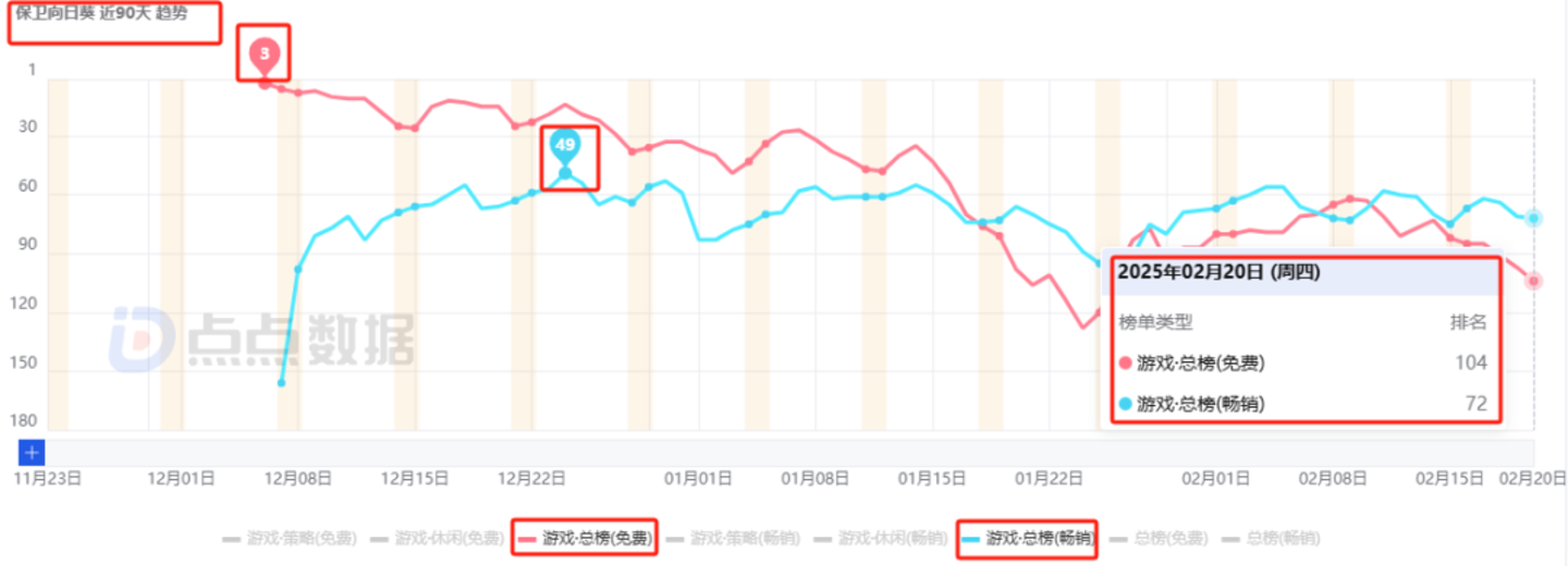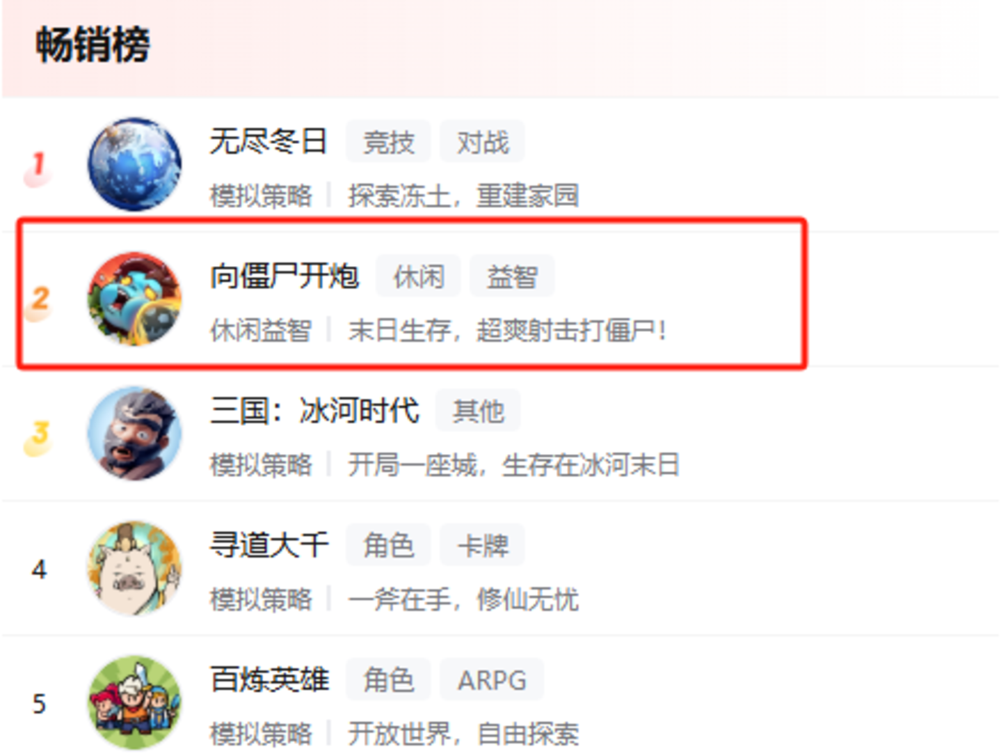 2024年12月6日,《保卫向日葵》正式上线,当天便登上iOS游戏免费榜第3名,大概10天后该作上线小游戏版,并很快霸榜微信小游戏畅销榜TOP10,当前其依然位于第10的位置。