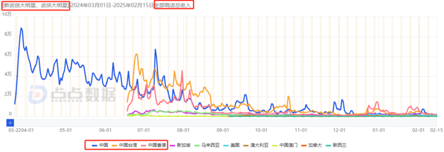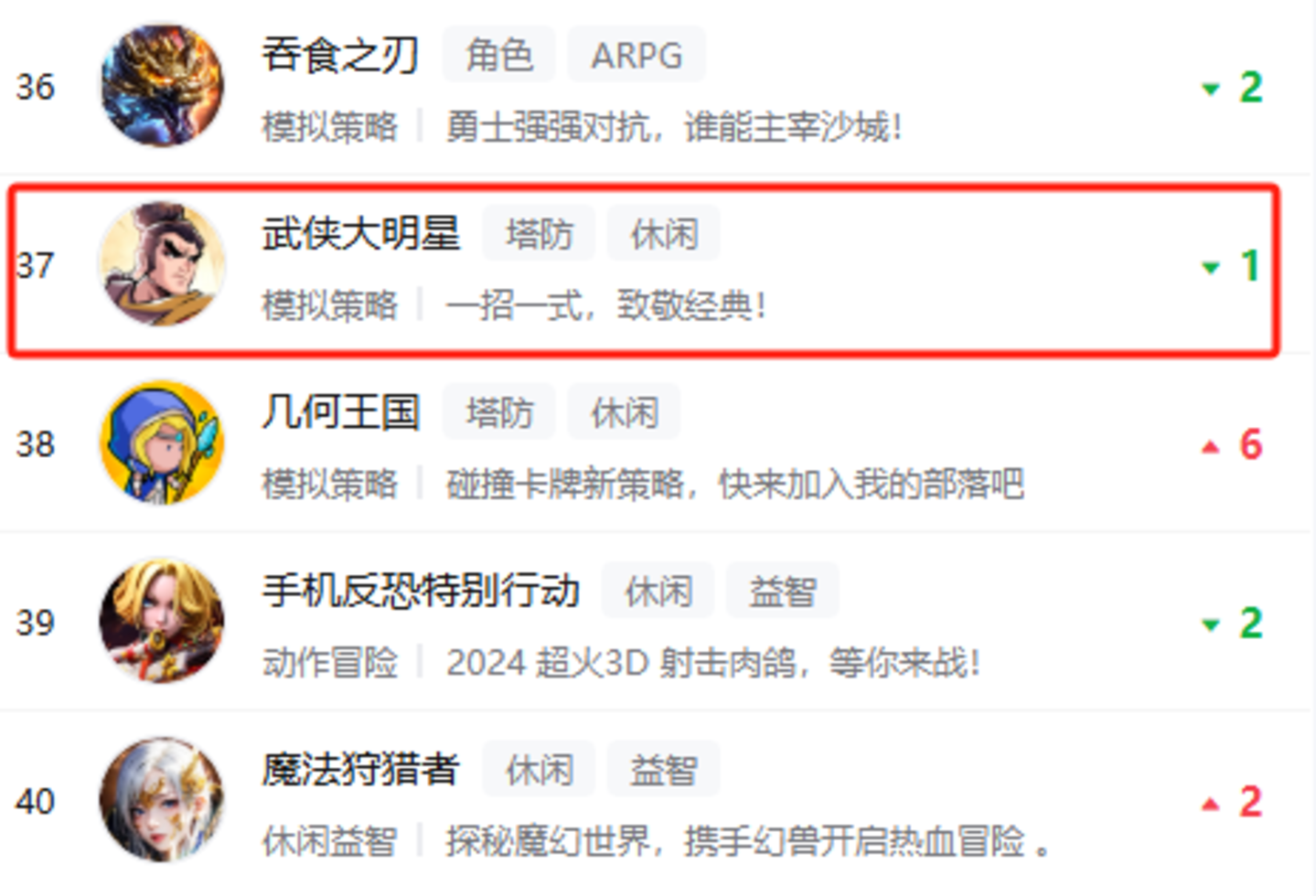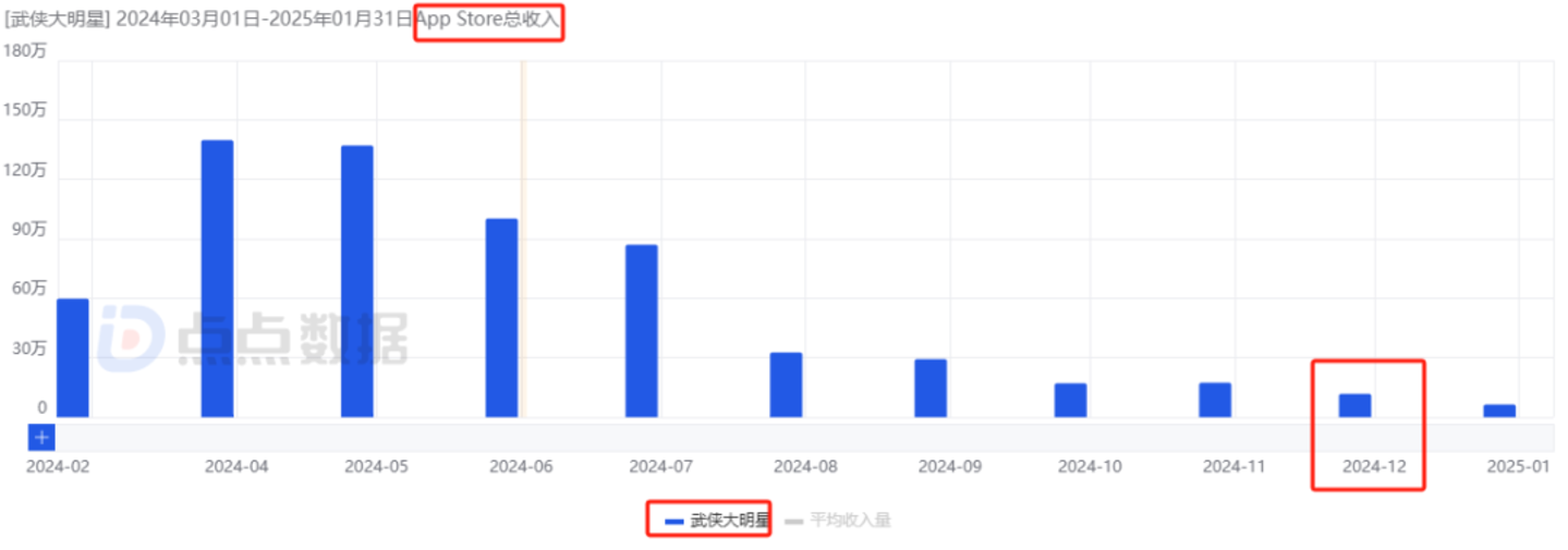 2024年3月22日,《武侠大明星》上线国内App Store,不到一周便登上iOS游戏免费榜第7、畅销榜40的位置,首月iOS端下载量达到43.3万,首月iOS端流水预估为1200万元。