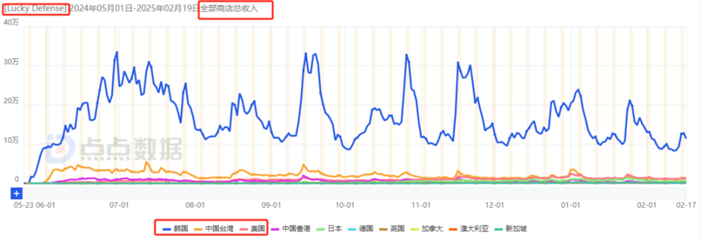 基于靶心Like、小鸡Like分别推出上述两款新游后,善于吸收Rogue类游戏优势的大梦龙途,又在去年5月底遇见了由韩国研发商111%开发的爆款新作《Lucky Defense!》(2024年全球流水3.5亿元,韩国占比79.08%)。