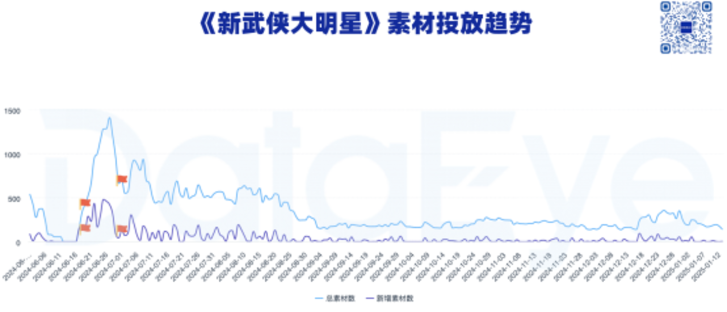 就投放而言,游戏6月初便开始买量,6月中旬至8月中旬整体力度较大,随后单日总素材迅速下滑至500以下,如此看来该作更重视繁中地区,12月24日因与港式武侠剧《风云》开启联动,投放又小幅增长,但整体依然非常克制。