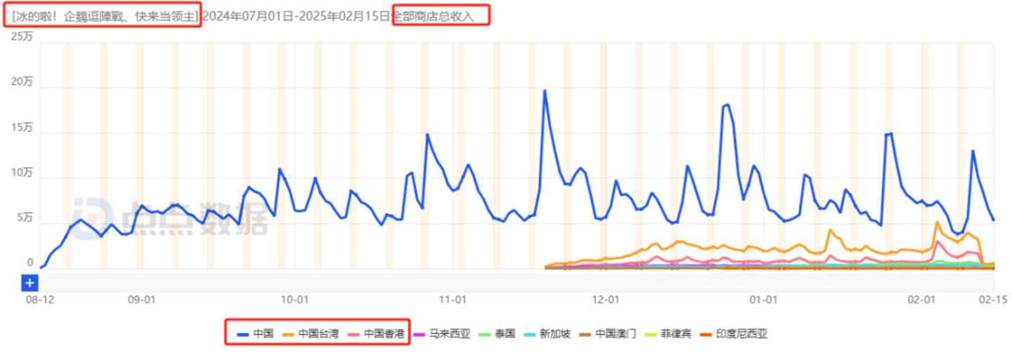同样是在国内上线后的三个月左右,也就是2024年11月19日,该作选择出海港澳台、新马泰等8个国家及地区,海外版名为《冰的啦!企鵝逗陣戰》,初期月均投放素材量在5400组左右,首月收获流水560万,仅为国服iOS端50%,但之后月流水开始缓速增长,当前月流水预估为904万。