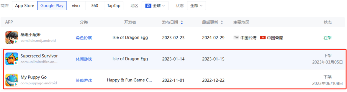 2022年底至2023年初,其有发行了SLG《My Puppy Go》和吸血鬼-Like微创新产品《Superseed Survivor》均表现一般,2023年中前便相继下架。