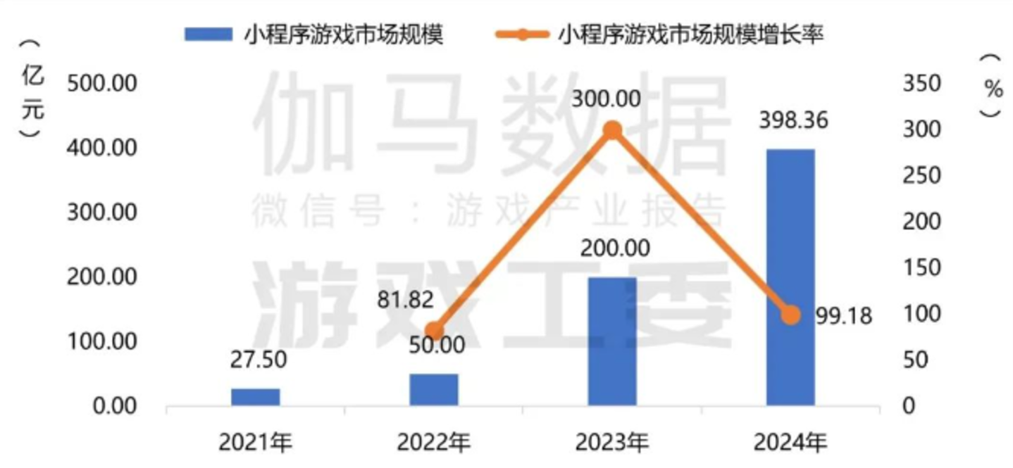 据中国音像与游工委发布的《2024年中国游戏产业报告》显示,国内小游戏规模在2021年与2022年仅为27.5亿元和50亿元;2023年直接实现同比增长300%,规模达200亿;来到2024年,同比增速虽然有所下滑但依然达到99.18%,市场收入近400亿元,预计今年市场规模将增长到600亿以上。