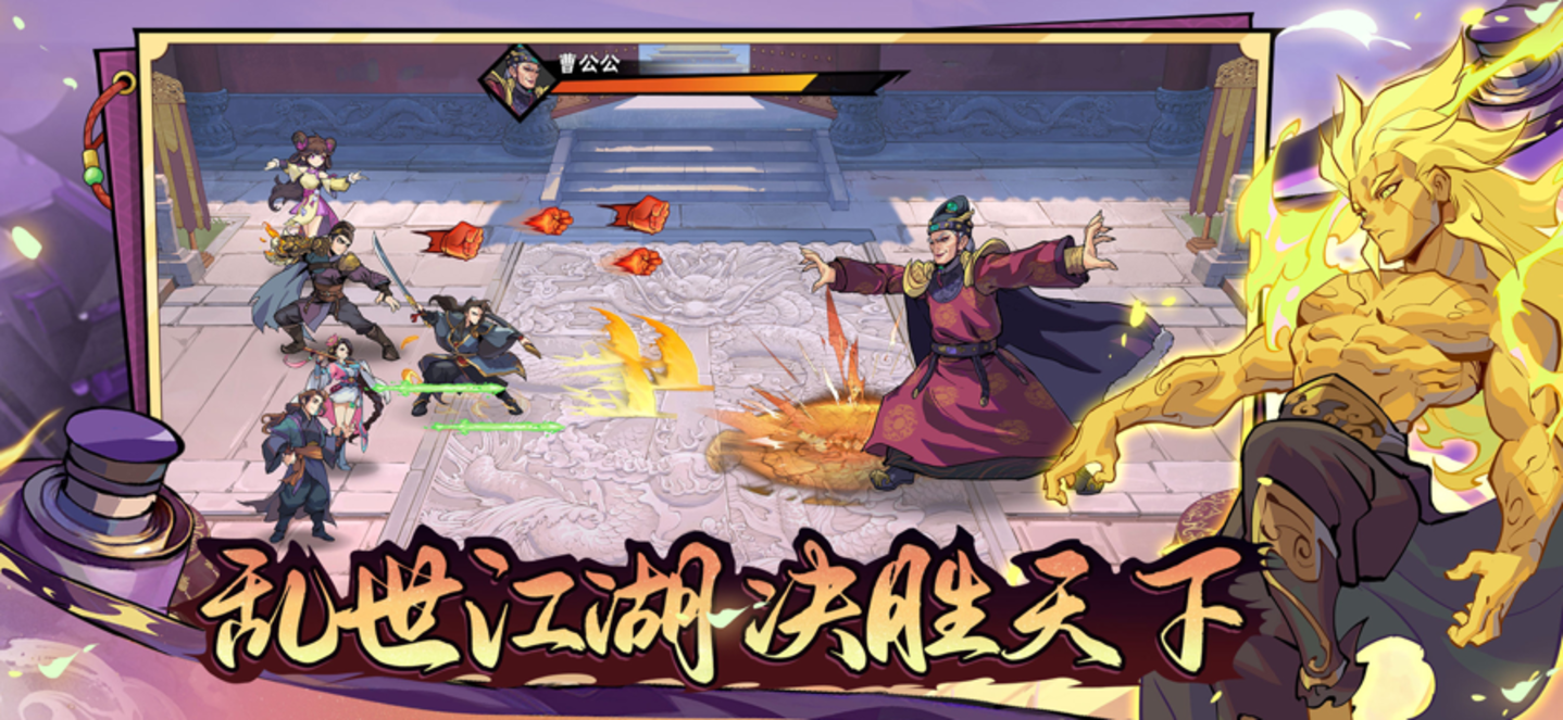 玩家作为武林盟主,需要集结各路英雄豪杰、收集各种武学秘籍,将二者进行正确的搭配从而组成力量强大的正义之师,击退神秘教派。作为一款小鸡Like,玩法上其融合了放置卡牌、轻度肉鸽、割草、RPG养成、塔防等元素。