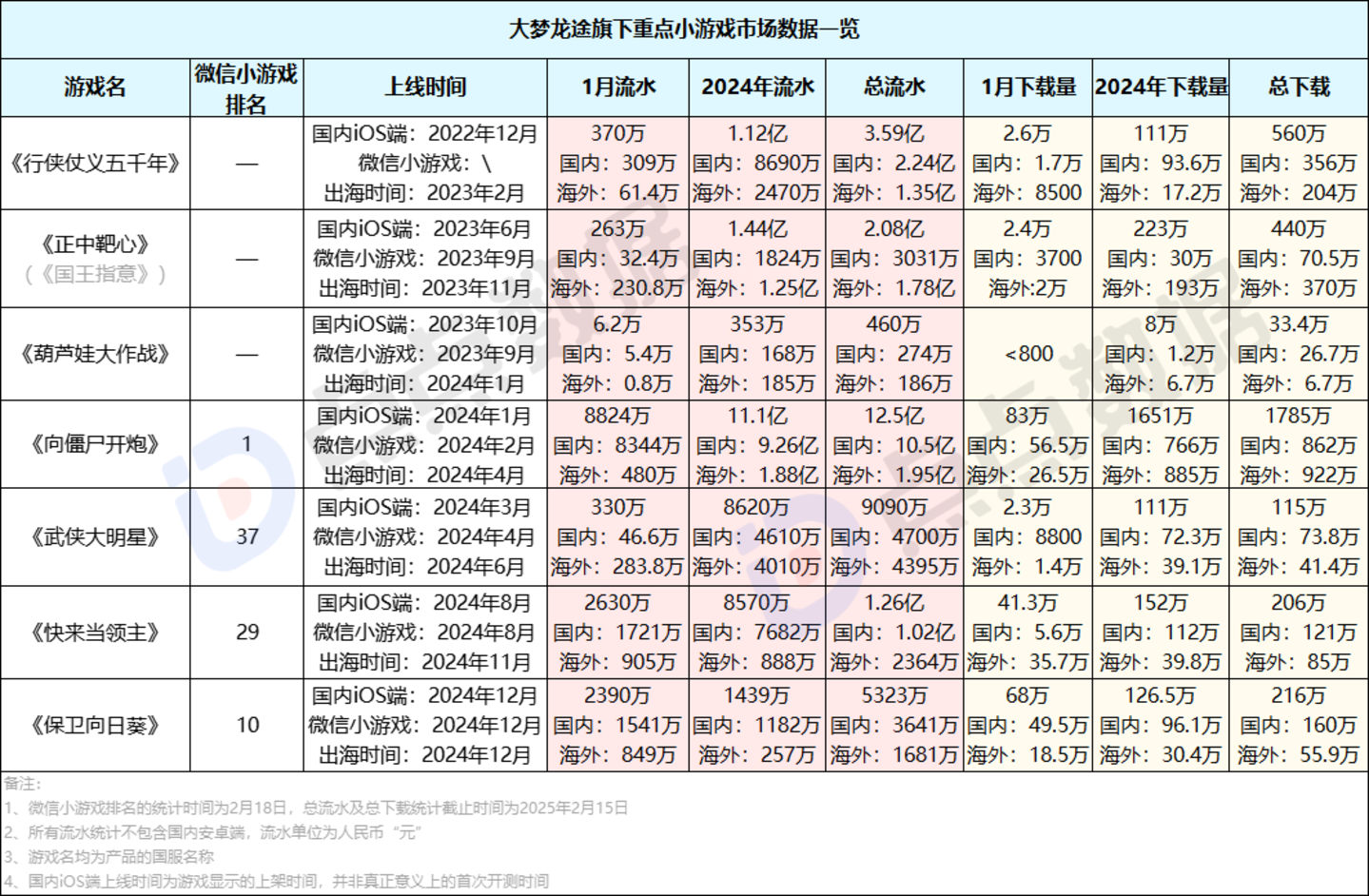 在《正中靶心》获得巨大成功后,4个月后也就是2023年9月,《葫芦娃大作战》上线,该作是一款改动较大的合合-Like,2024年1月其海外版《神仙救救我》出海,然而该作整体表现一般,全球累计流水仅为460万,是大梦龙途旗下表现最差的重点产品。