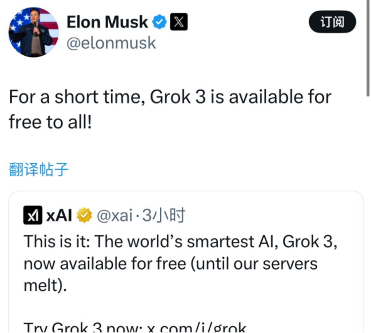最让人崩溃的是,又过了一天,也就是北京时间2月20日上午十点半,xAI的X官方账号突然宣布:“全世界最聪明的AI,Grok 3,现在免费(直到我们的服务器崩溃)”。