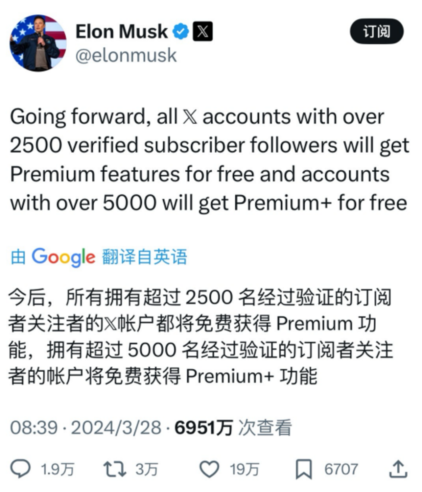 甚至有人引用了一年前马斯克的帖子,来表达对他破坏承诺的不满。在那条帖子中,马斯克承诺今后所有订阅超过5000人的X用户都将自动获得Premium+的权益。
