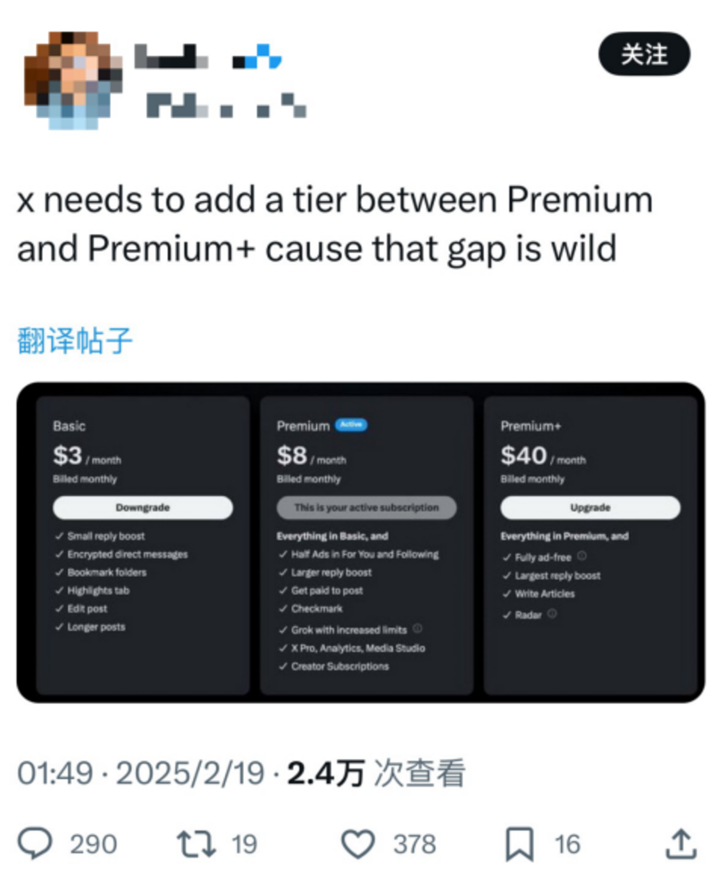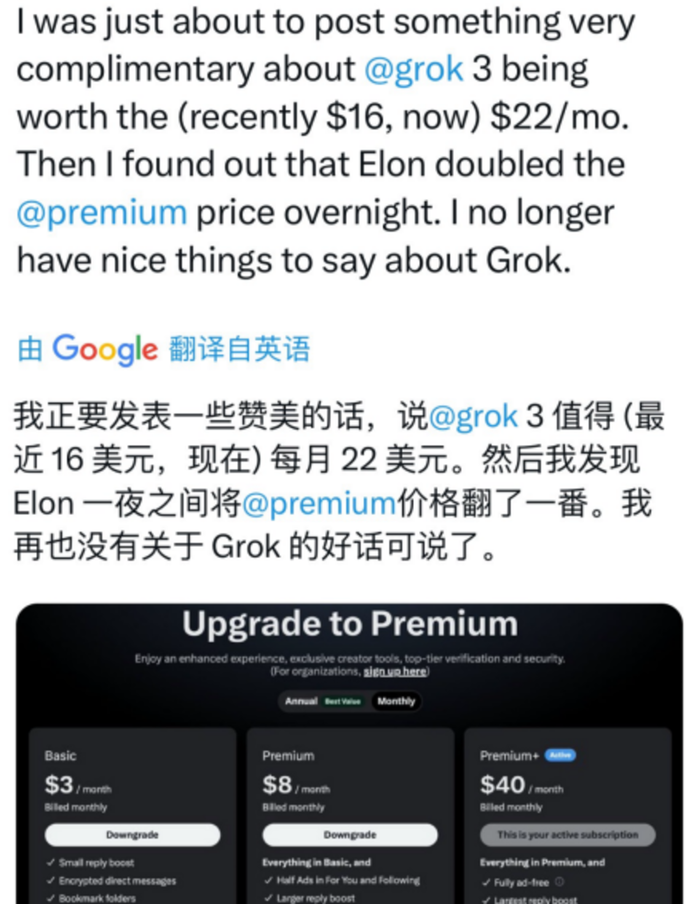 更别提“每月40美元”也是在发布会之后涨价的结果,要不是Grok 3发布,X平台美国区Premium+的订阅费用仅为22美元。