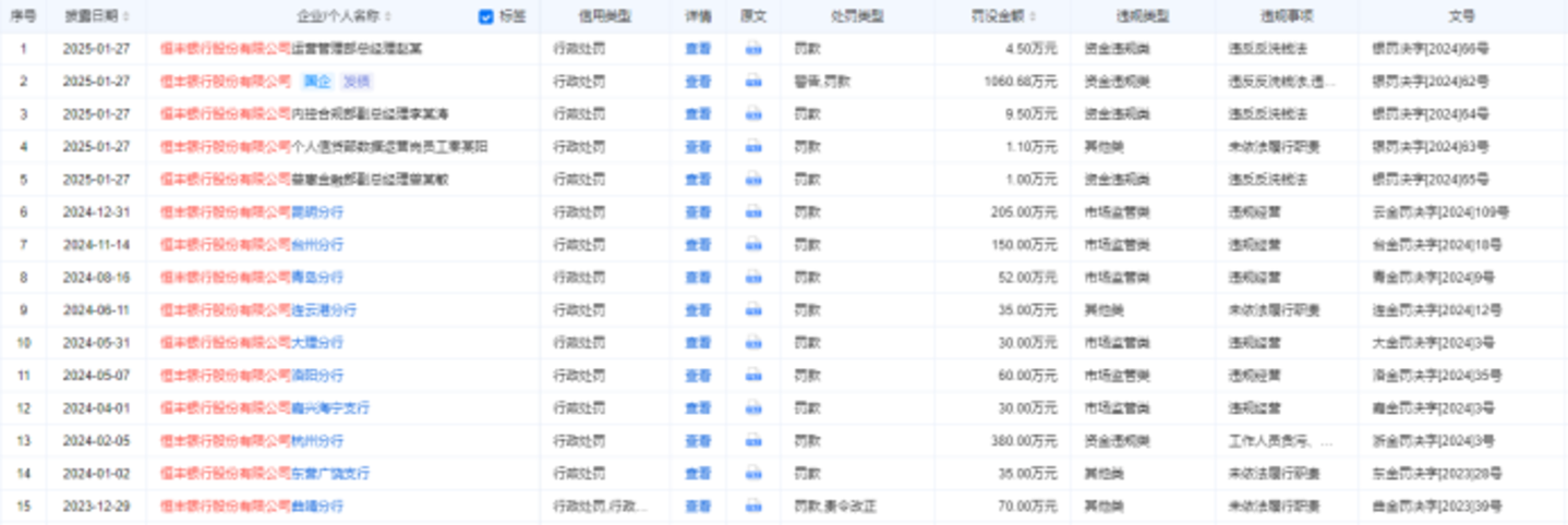 2024年12月31日,恒丰银行昆明分行因“未遵循利费分离原则,浮利分费”,被云南省金融监管局罚款205万元。该行时任投资银行部总经理张锋和公司金融部副总经理(主持工作)彭勃分别被处以警告处罚。