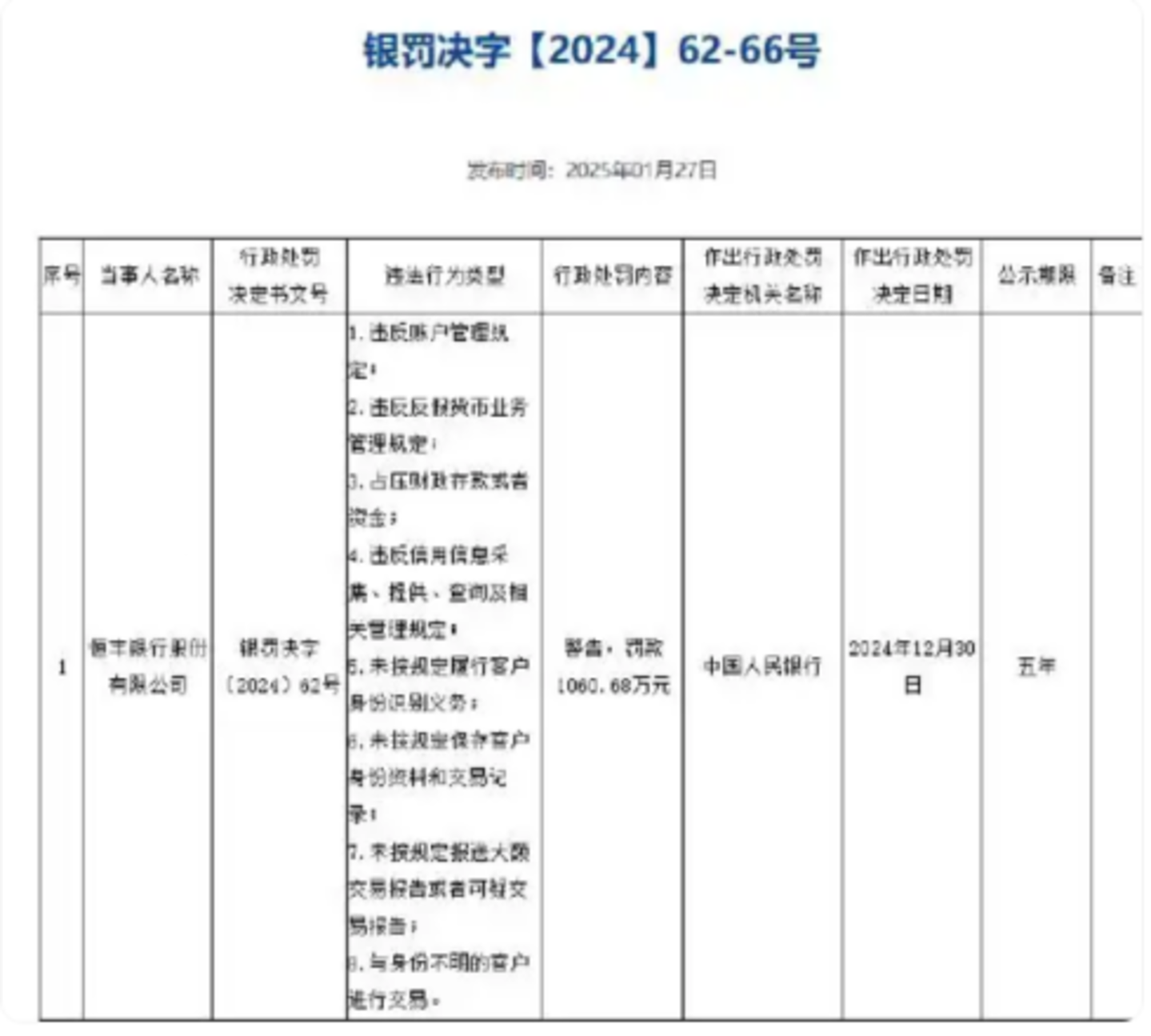 1月27日,人民银行公布的罚单显示,中国农业银行、光大银行、民生银行、恒丰银行等4家银行合计被罚没超9900万元,被罚原因多涉及未按照规定履行客户身份识别义务、与身份不明的客户进行交易等多项违法行为。其中,央行对恒丰银行开出1060.68万元巨额罚单,并对其进行警告的行政处罚。