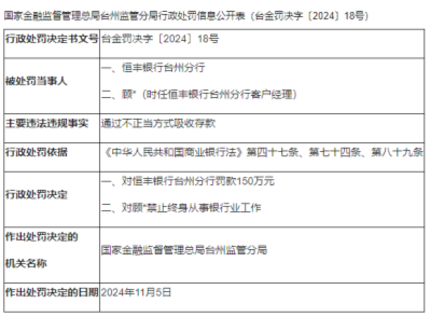 2024年11月5日,恒丰银行台州分行因“通过不正当方式吸收存款”被台州金融监管分局罚款150万元,时任客户经理顾某被禁止终身从事银行业工作。