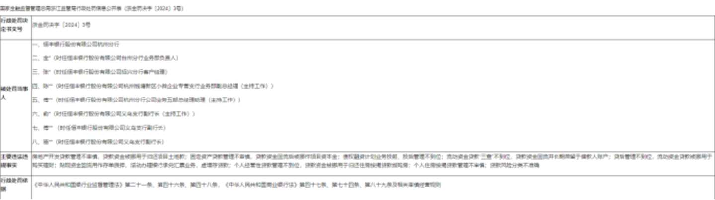 按时间线来看,2024年2月5日,浙江金融监管局对恒丰银行杭州分行开出罚款380万元罚单。违规类型是资金违规类,金某、张某、陈某、傅某生、俞某警、傅某旻、骆某新在内的八人被警告。